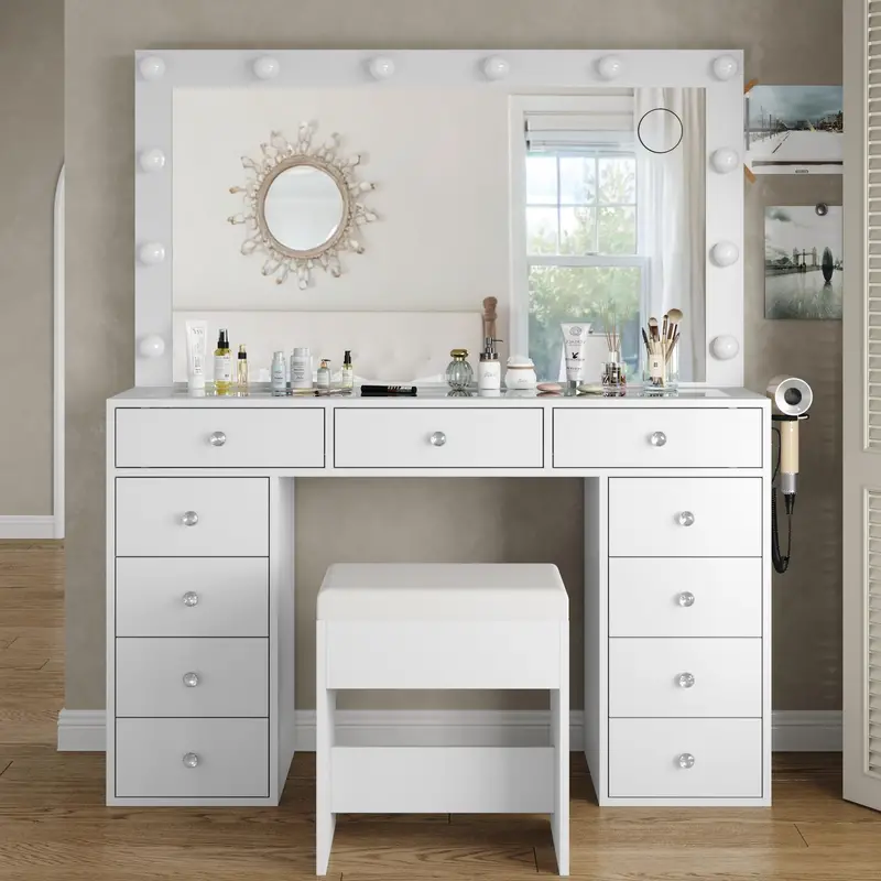 Capacidad de almacenamiento: ¿Sigues preocupándote por una gran cantidad de cosméticos? ¡El tocador lo hace todo! 11 cajones deslizantes de metal para maquillaje de gran tamaño hacen que tu entorno de maquillaje esté bien organizado. ¡Puede contener todos tus cosméticos perfectamente! La mayor sorpresa es que este tocador puede hacer que tu dormitorio se vea muy ordenado y elegante.