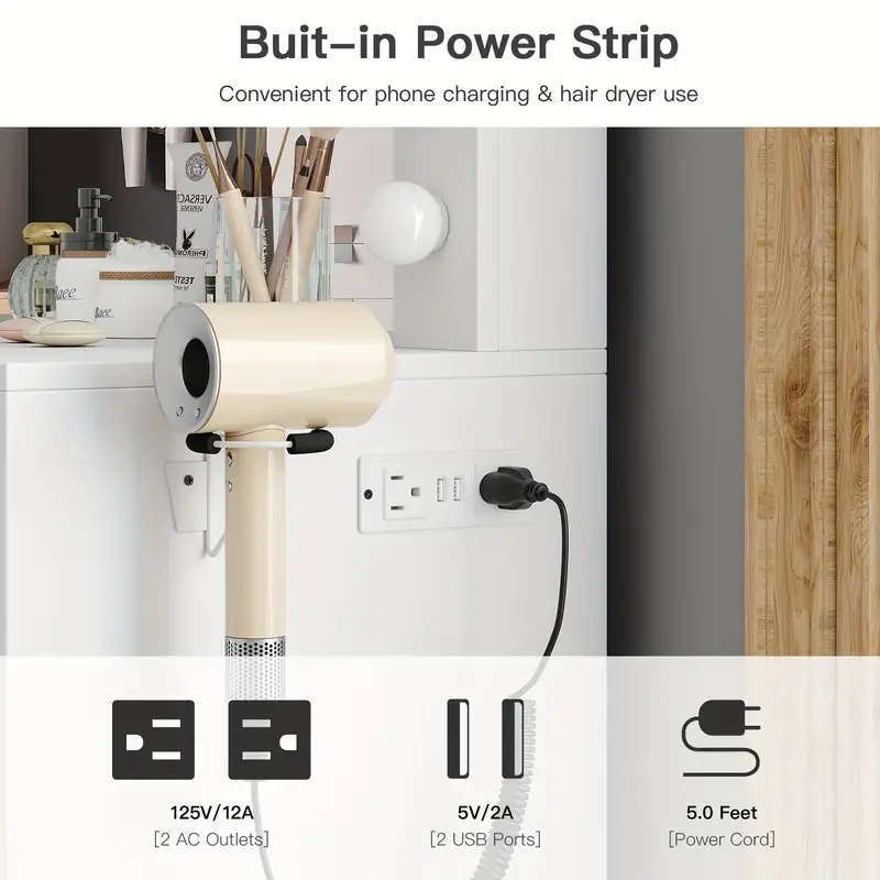 Mesa de tocador con estación de carga: Esta mesa de tocador viene con una estación de carga y un soporte para secador de pelo, incluyendo 2 enchufes estándar y 2 puertos USB, que pueden conectarse de manera más conveniente a secadores de pelo y rizadores, y también pueden proporcionar energía para cargar su teléfono móvil, tableta u otros dispositivos, permitiéndole tomar hermosas selfies después de aplicar maquillaje