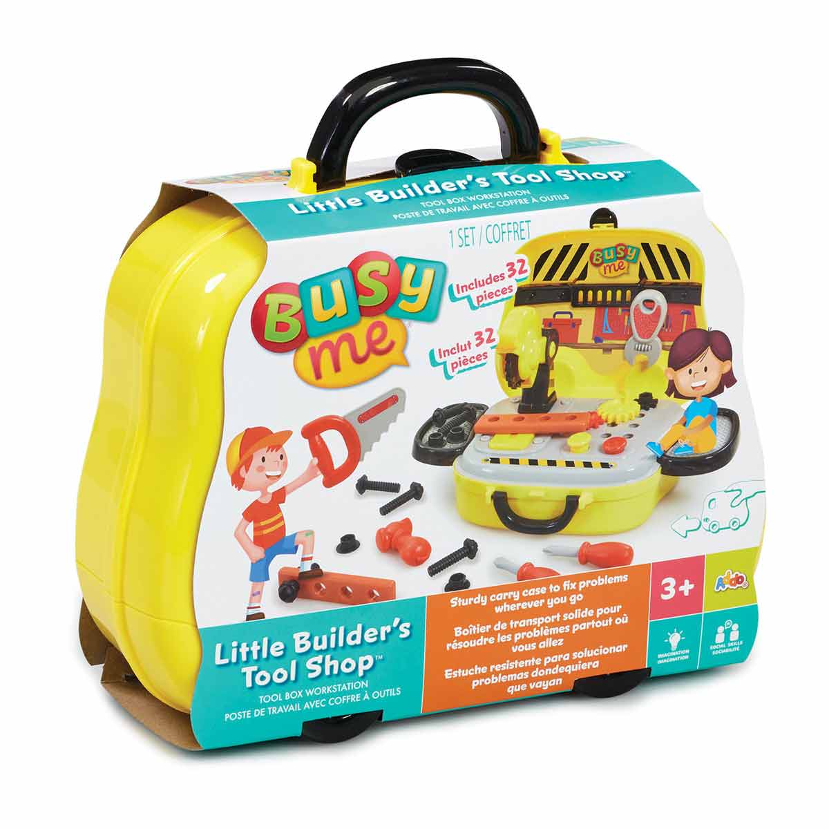 El robusto maletín de transporte contiene todo lo que tu pequeño necesitará para divertirse durante horas en un imaginativo juego de construcción. Engancha la parte superior y los laterales del taller y ponte a martillear, serrar y atornillar. Un gran complemento de juego de rol para cualquier caja de juguetes.