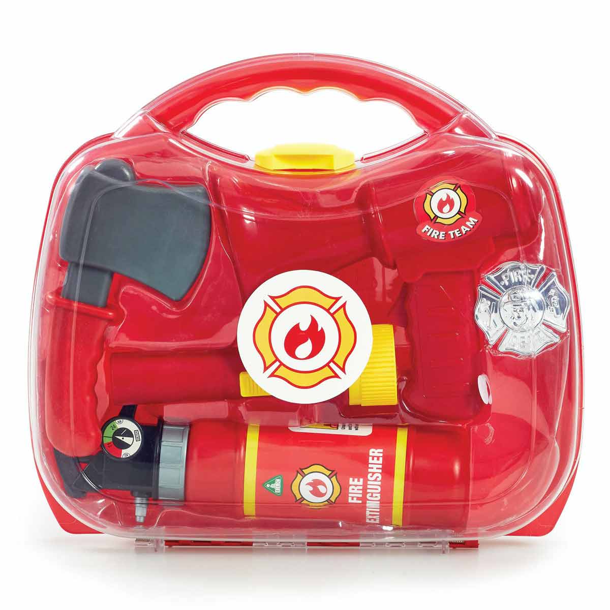 - Set de accesorios de plástico de Bombero en un práctico maletín de transporte.