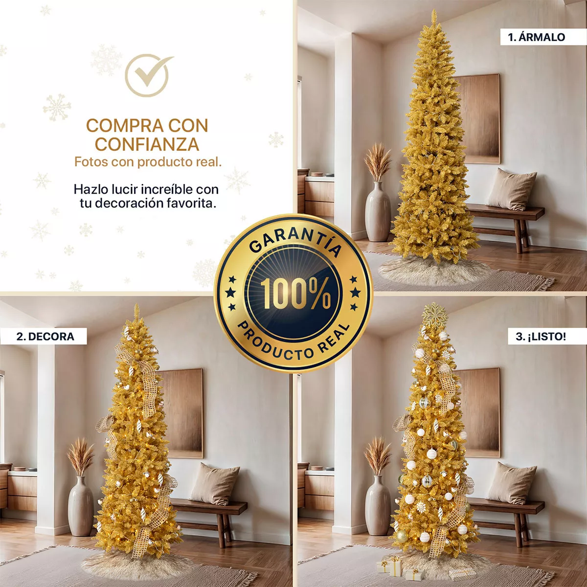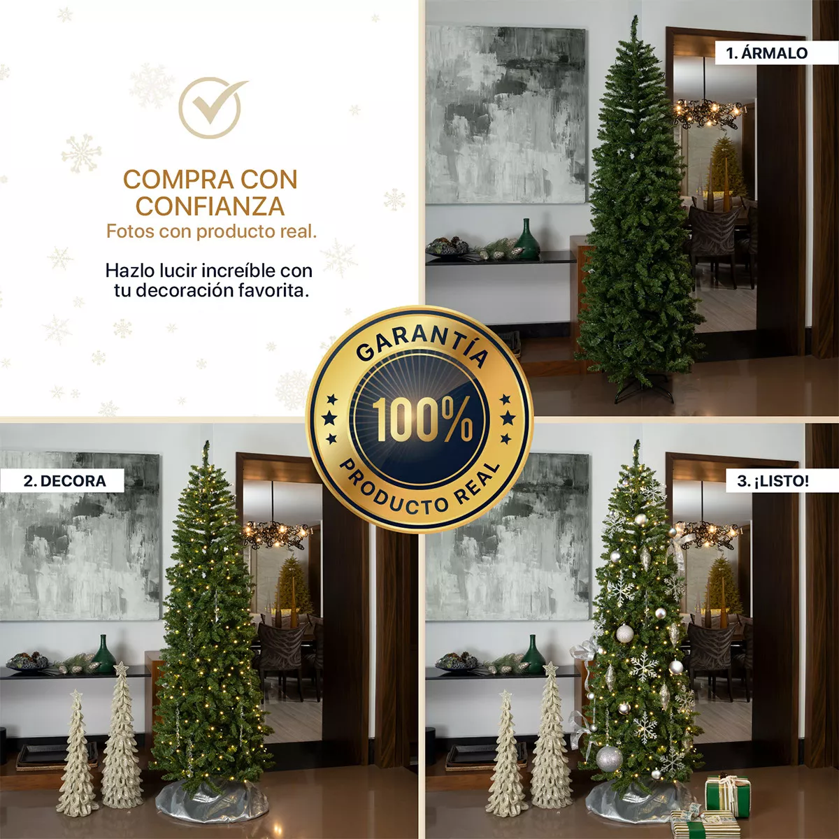 ASPECTO COMPACTO Y ESCARCHADO: Nuestros pinos nevados de Esquimal traen la magia del paisaje invernal a tu hogar. El blanco de la nieve artificial realza los colores y luces de tus adornos, haciéndolos destacar con mayor intensidad para una decoración de Navidad encantadora. Además, su forma tipo lápiz, delgada y estilizada, aporta elegancia sin ocupar mucho espacio, ideal para áreas reducidas. (Aplica únicamente en Modelo Verde Nevado)