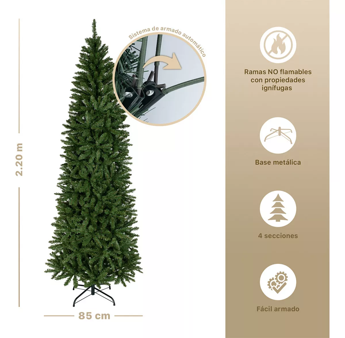 • 1 árbol de navidad artificial tipo lápiz, delgado y frondoso, estilo Pino canadiense | Tamaño grande: 2.20 m x 0.85 m | 1150 ramas de PVC.