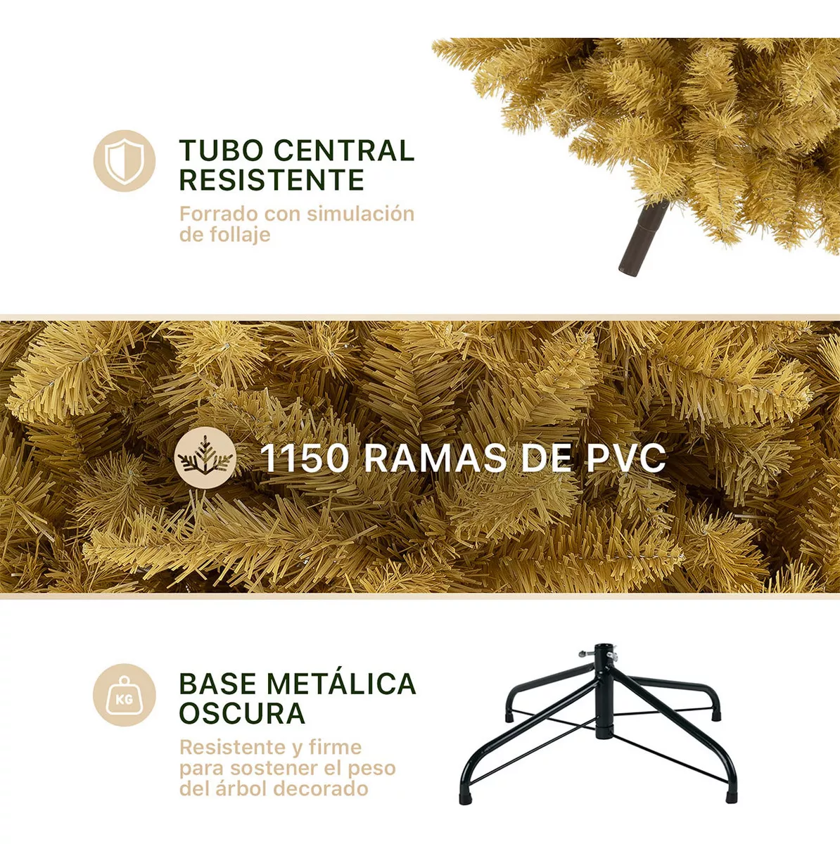 • RAMAS DE PVC DURADERAS: Las ramas de PVC de nuestros árboles de pino son altamente resistentes, conservan su densidad y color con el paso del tiempo y cuentan con propiedades ignífugas no inflamables, garantizando máxima seguridad y durabilidad.