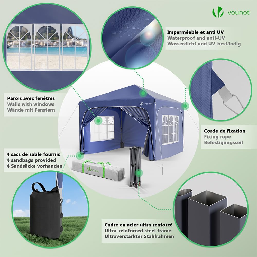 - FÁCIL DE INSTALAR: Diseñada con un sistema pop up, nuestra carpa plegable de 3x3M es realmente fácil de montar o desmontar en solo unos minutos, sin esfuerzo ni herramientas. Su diseño emergente intuitivo permite una configuración rápida, ideal para fiestas, ferias comerciales, fiestas al aire libre, picnics, campamentos u otras actividades al aire libre.