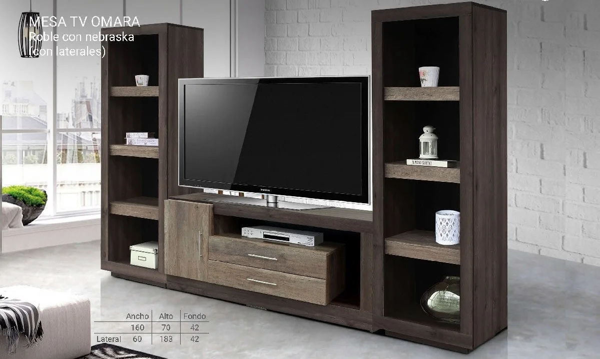 Centro de Entretenimiento. Fabricado en madera y tablero industrializado de madera. Con acabado color Roble con Nebraska. Medidas Lateral 60 x 183 x 42 Medidas Espacio TV. Medidas: 280 x 70 x 42 . NOTA: Los accesorios y otros muebles de las xfotografías, se venden por separado. Por efectos de iluminación de la fotografía, algunos tonos de colores pueden variar con respecto al color real.