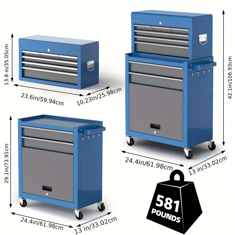 La aplicación versátil de este cofre de herramientas sobre ruedas ofrece dos modos de combinación, permitiendo su uso de forma independiente o en conjunto según sea necesario para el trabajo. Los cajones están equipados con rodamientos de bolas para una apertura y cierre suave. Cuenta con 4 ruedas giratorias de 360°, incluidas 2 ruedas de freno de goma sólida y 2 ruedas direccionales, lo que facilita su movimiento y operación. Además, se puede estacionar de forma segura en posición sin generar ruido ni causar daños al suelo.