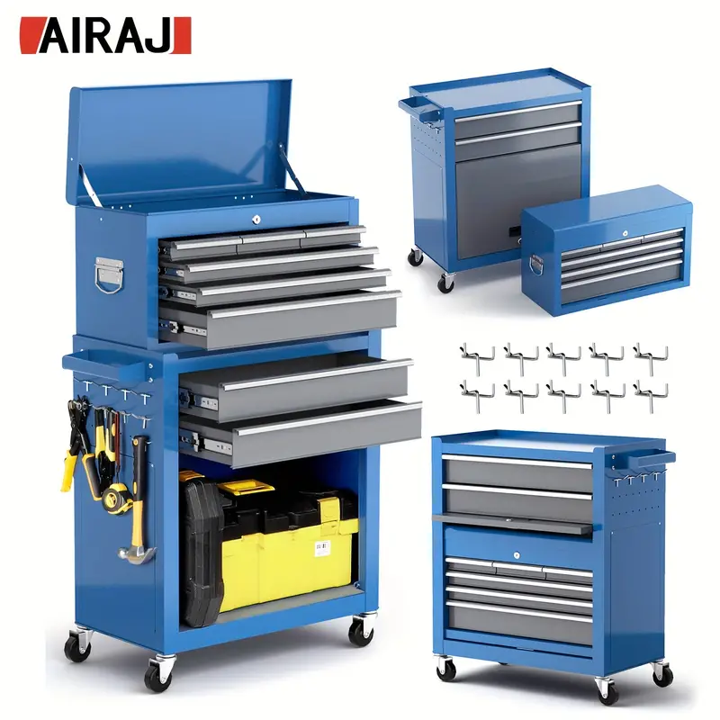 El carrito de herramientas con ruedas incluye 8 cajones, fabricados en acero laminado en frío engrosado, con una resistente y anti-rayaduras superficie de trabajo contra el óxido. Los cajones cuentan con deslizadores de rodamiento de bolas y almohadillas antideslizantes para mantener las herramientas seguras y evitar que se muevan durante el traslado.
