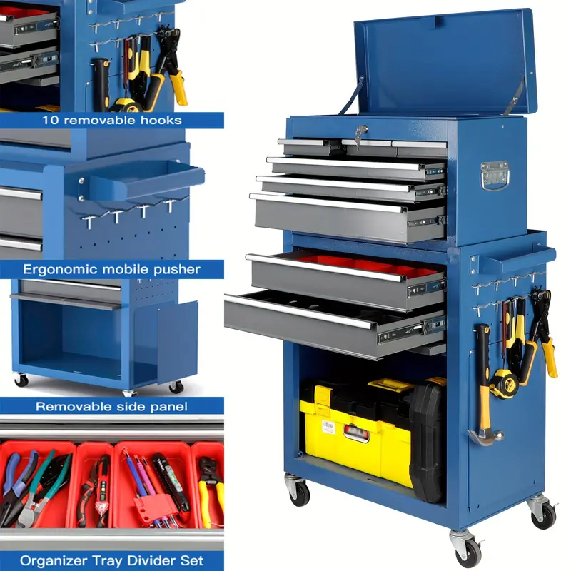 Esta caja de herramientas ofrece mucho espacio para guardar sus herramientas de taller, con 10 ganchos adicionales en el exterior para mayor almacenamiento. Hay un área espaciosa debajo para almacenar herramientas más grandes, lo que facilita la organización y el almacenamiento de sus herramientas. La caja de herramientas con ruedas es ideal para usar en fábricas, talleres, almacenes, talleres de reparación y para almacenar herramientas domésticas.