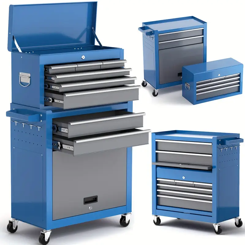 Solución de almacenamiento de herramientas con 8 cajones sobre ruedas, que incluye una caja organizadora extraíble, sección superior desmontable con sistema de bloqueo y amplia capacidad para uso en taller y garaje en color azul.