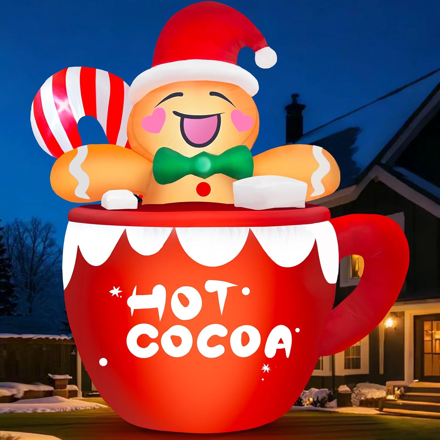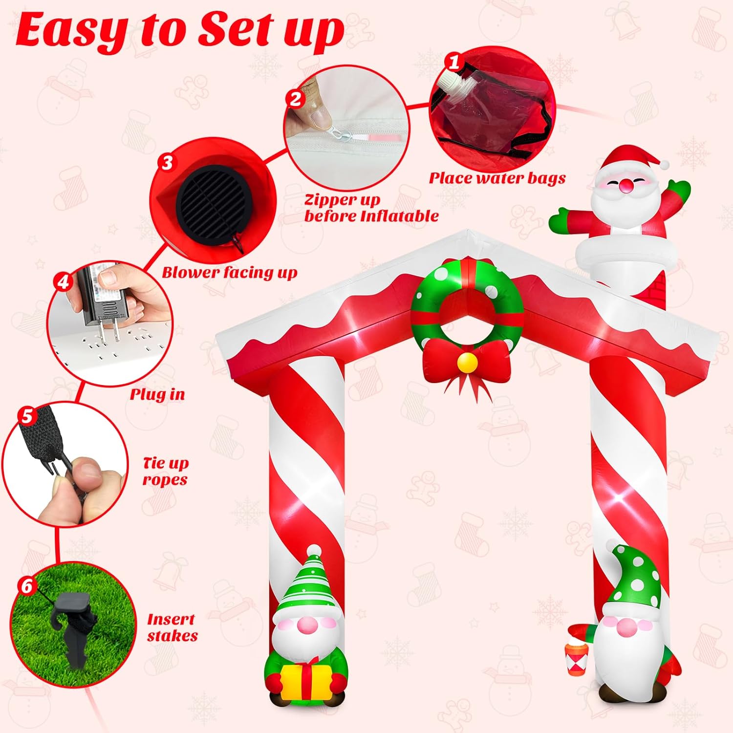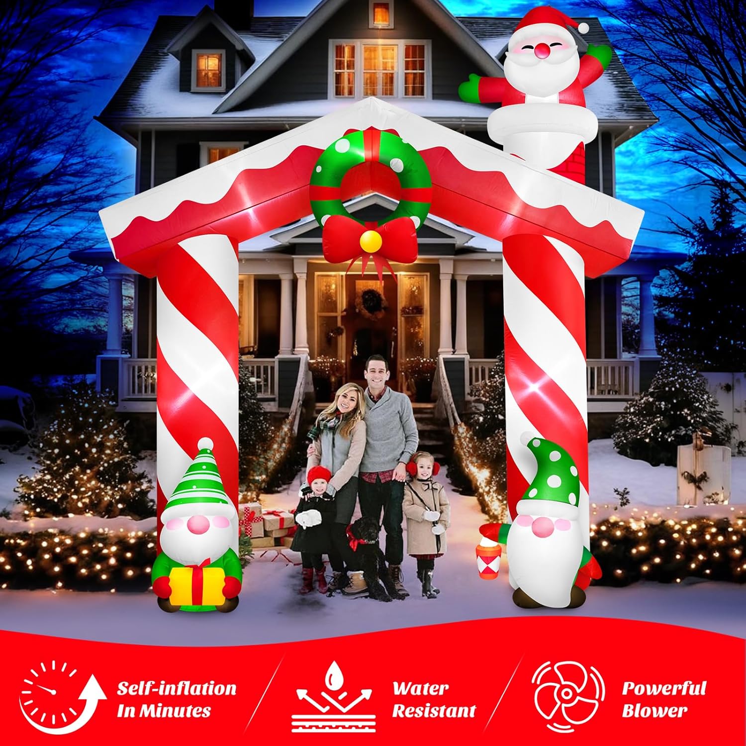 - Arco inflable Gigante Llamativo: Las decoraciones de arco inflable de gnomos de 10 pies tienen 8 luces LED blancas brillantes incorporadas, que iluminan instantáneamente su jardín. Cuando cae la noche, la altura imponente hace que el arco inflable se destaque en su jardín. El diseño colorido e innovador crea una atmósfera muy festiva y animada, haciendo que su hogar y esta enorme decoración de arco navideño se conviertan en un faro para crear una atmósfera festiva alegre
