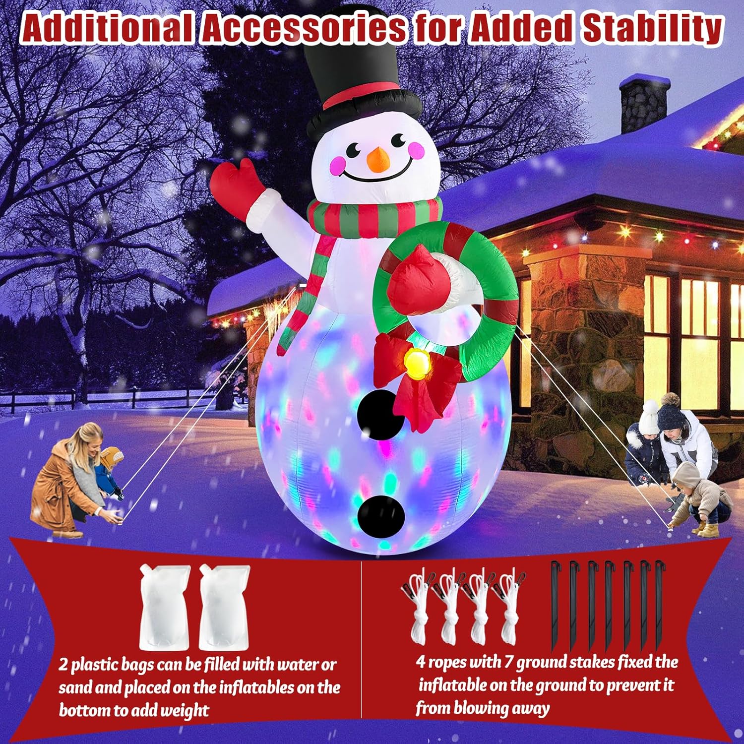 - Estable de Usar: Nuestras decoraciones inflables para exteriores utilizan 10 estacas y 4 cuerdas para fijarlas al suelo, y están reforzadas con 2 bolsas de agua para mantener la estabilidad, no hay necesidad de preocuparse de que su inflable navideño se vaya volando con el viento. Este arco navideño será un complemento perfecto para sus decoraciones navideñas al aire libre, muy adecuado para interiores / exteriores, jardín, patio, patio, fiesta, centro comercial, etc. Impresione a sus vecinos, familiares y amigos