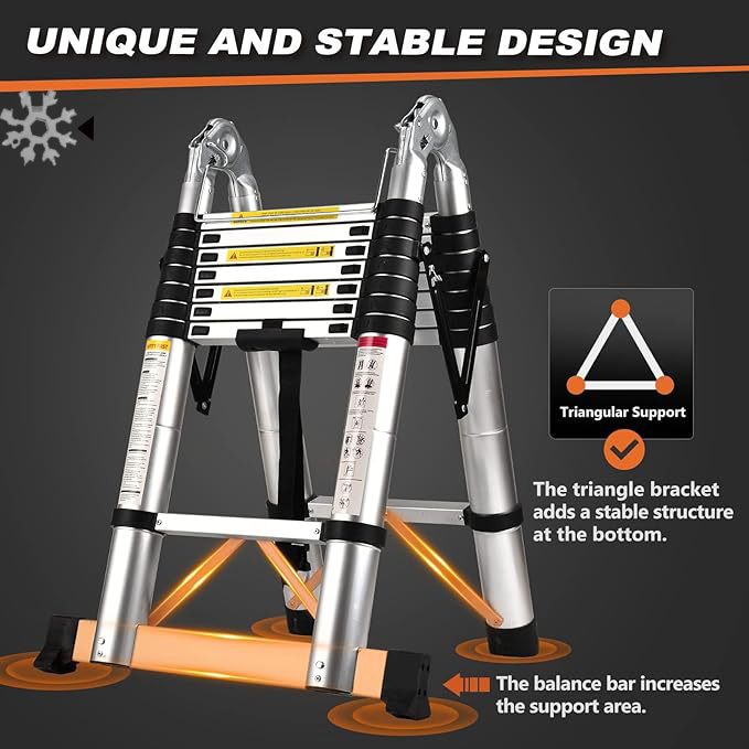 - Escalera multiusos con marco en A: ajustable de 3 pies a 16 pies. Los dos nuevos estabilizadores triangulares añadidos en la escalera telescópica mejorada pueden reducir el temblor. La escalera de extensión se puede utilizar como escalera de marco de 2,5 m + 2,5 m o 16,5 pies para techo y escaleras de ático.