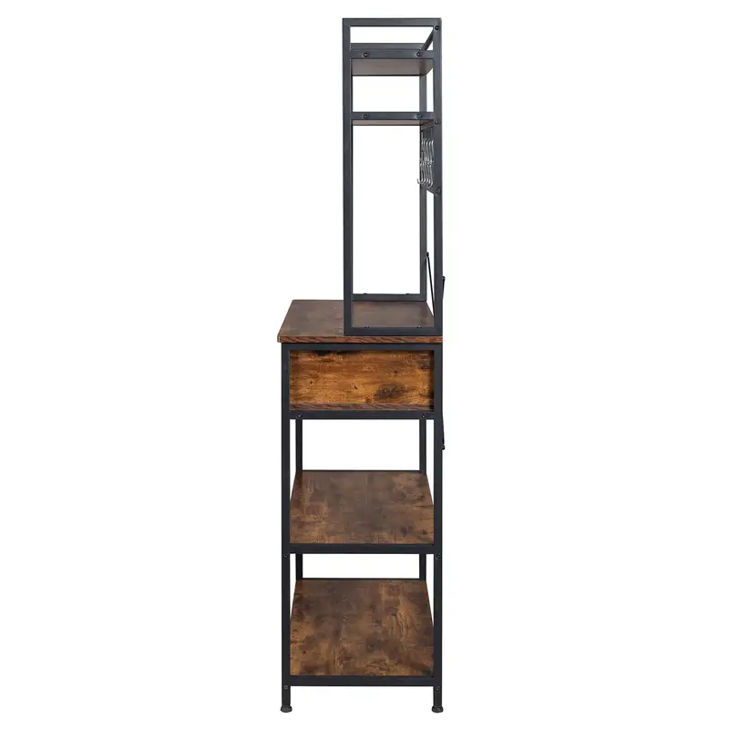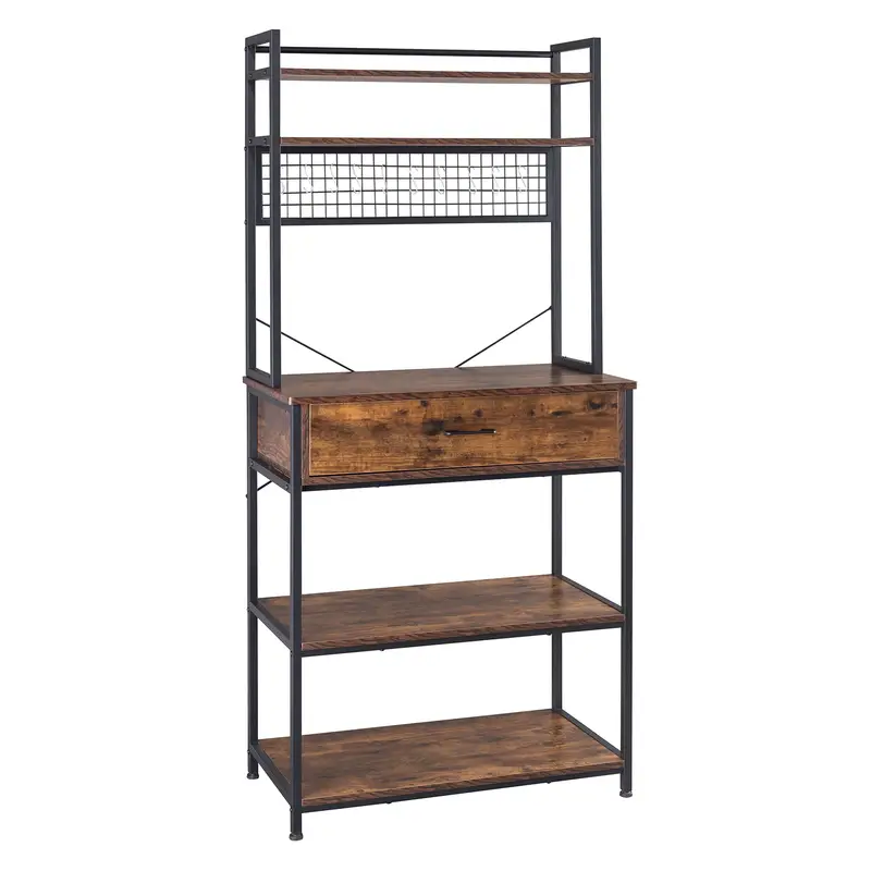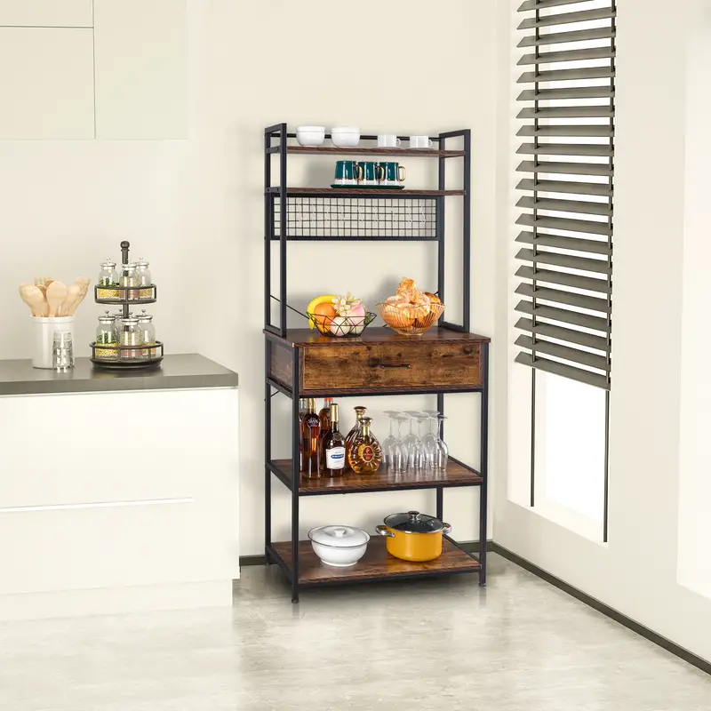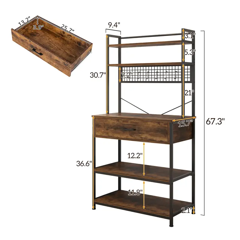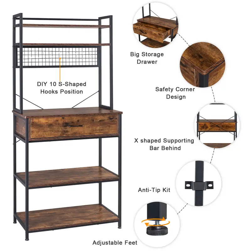 1. 【Ahorro de espacio y multifuncional】: este estante de almacenamiento tiene una gran utilidad, no solo una isla de cocina, sino también como una elegante estantería, un soporte para microondas, un organizador de estantes de especias, un gabinete de baño, una tabla de vinos para la sala de estar y puede armonizar con cualquier otro mueble rústico en cualquier habitación. Las estructuras verticales no ocupan espacio y añaden más espacio de almacenamiento para el dormitorio, la cocina, la despensa o el baño. 2. 【Todo en su lugar】: Viene con un total de 3 estantes inferiores y 2 estantes superiores, este estante para microondas es una excelente opción de almacenamiento para la cocina comedor. Es ideal para guardar el microondas, el horno y algunos de sus otros utensilios de cocina o piezas y piezas, así como para almacenar especias, platos y cualquier otra cosa que desee. ¡Tu cocina se volverá ordenada! 3. 【Diseño de encimera y conejera grande】: Este soporte de cocina cuenta con una mesa de 31.5 "L x 15.7" D para proporcionar una superficie de trabajo resistente, que es duradera y fácil de limpiar. Dos estantes superiores de listones son ideales para exhibir sus libros de cocina favoritos, frascos de especias y botes de productos secos. 4. 【Construcción sólida y varilla reforzada】 El marco de hierro fuerte y el aglomerado de calidad de 0.59 "de espesor mejoran la resistencia, por lo que puede poner todo lo que necesita en este estante para panadero. 5. 【ESTACIÓN DE TRABAJO UTILITARIA DE FÁCIL MONTAJE】 Le ofrecemos 10 ganchos en forma de S que son perfectos para colgar cucharas de cocina o paños de cocina. 6. 【Estabilidad y construcción robusta】 El marco de metal negro y las plataformas de madera marrón rústica duraderas se ven súper modernas. Pieza en forma de "X" para la parte posterior para mantenerlo resistente. El estante de almacenamiento de cocina marrón rústico está equipado con 4 pies ajustables, no es fácil rayar el piso y es adecuado para terre...