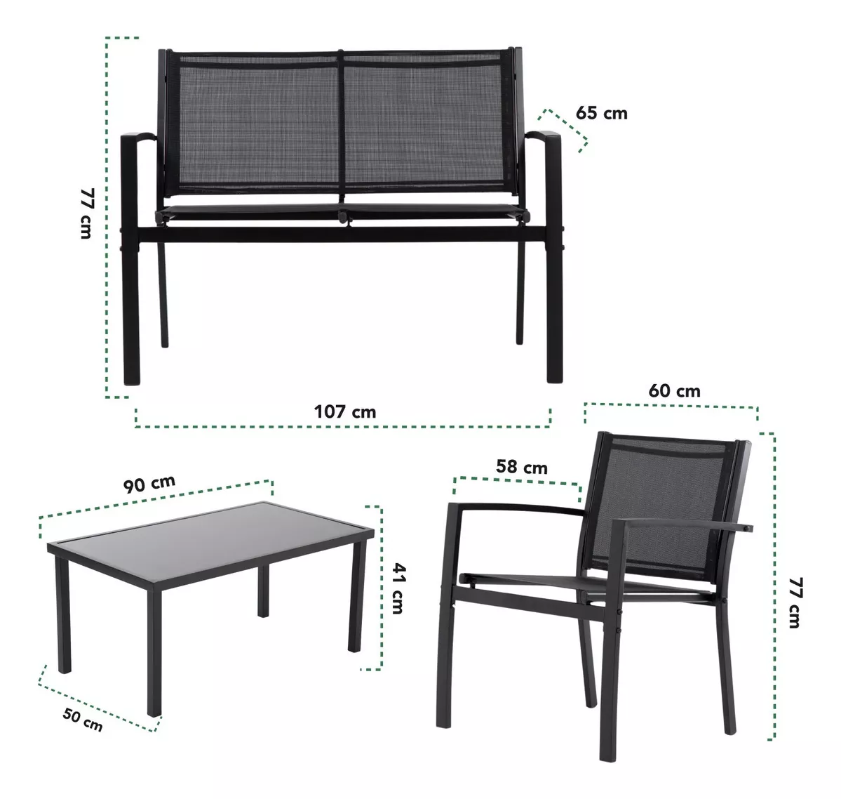 - Medidas del sillón doble: (LAxANxAL) 107x65x77 cm cm. Medidas de la mesa de centro: (LAxANxAL) 90x50x41 cm. Medidas de las sillas individuales: (LAxANxAL) 60x58x77 cm.
