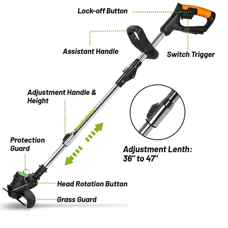 ● -La cortadora de césped inalámbrica pesa solo 3,29 libras, por lo que incluso las personas mayores o las mujeres pueden controlarla y usarla durante mucho tiempo.