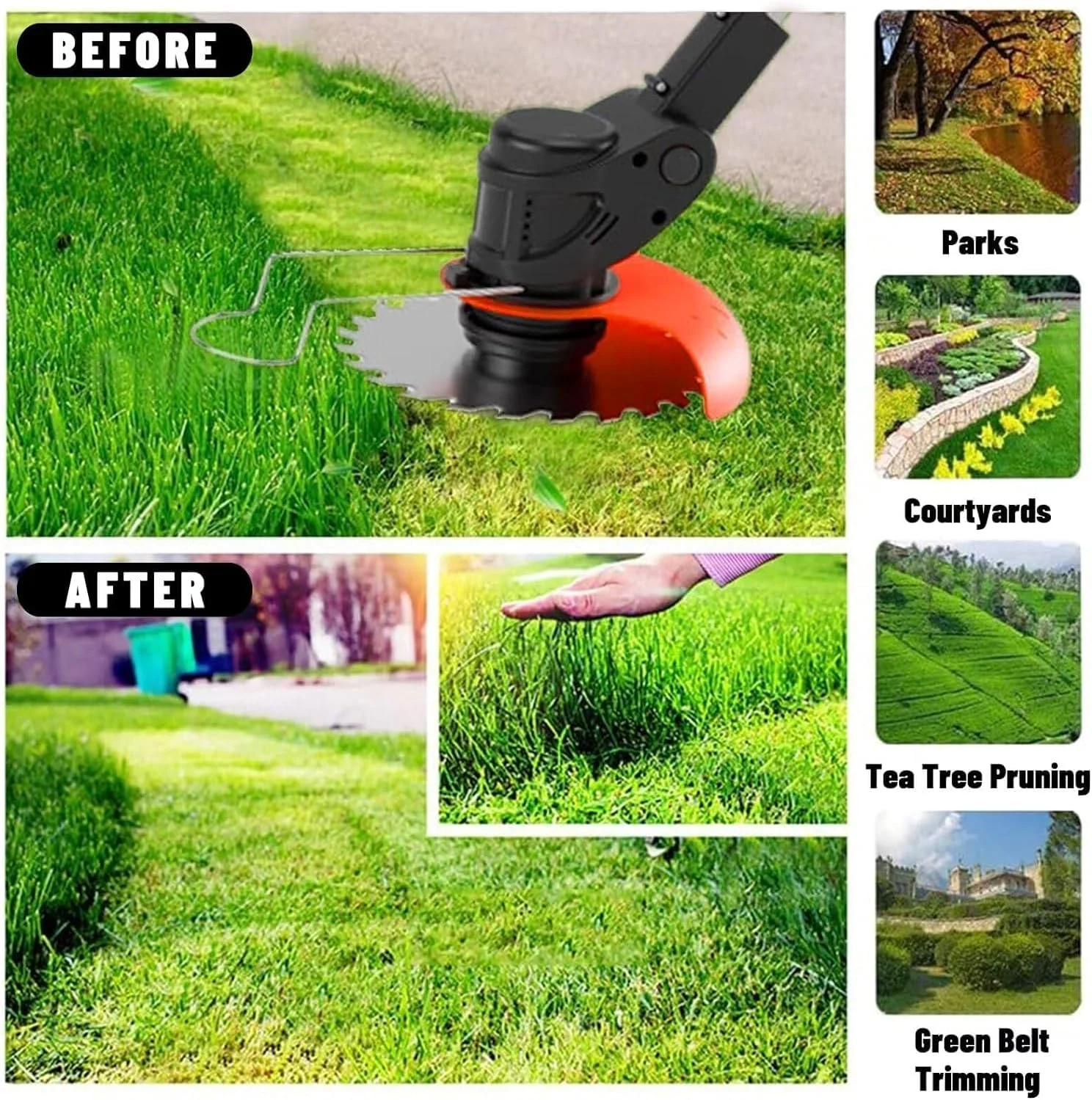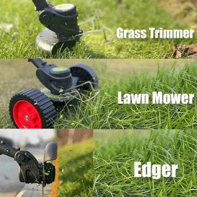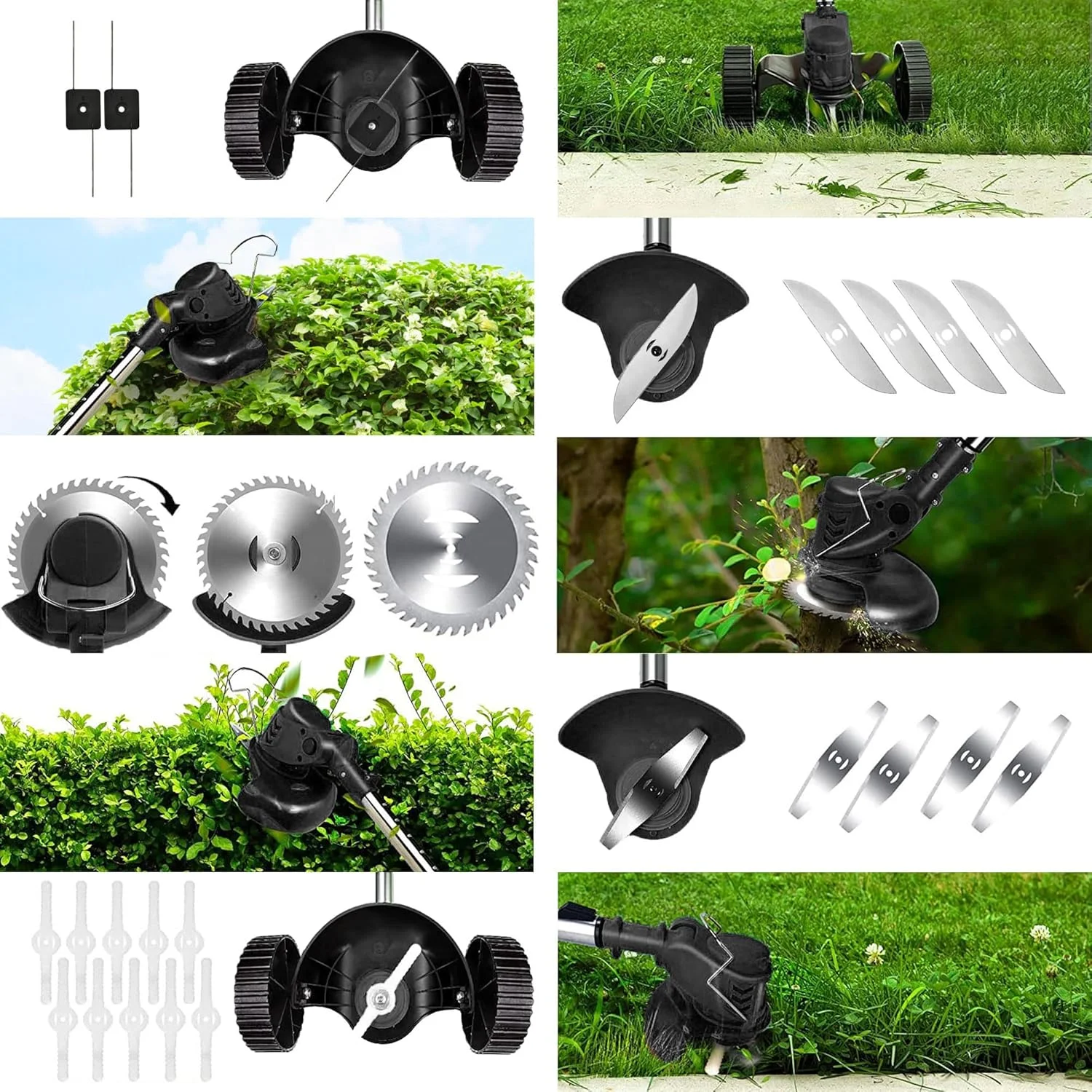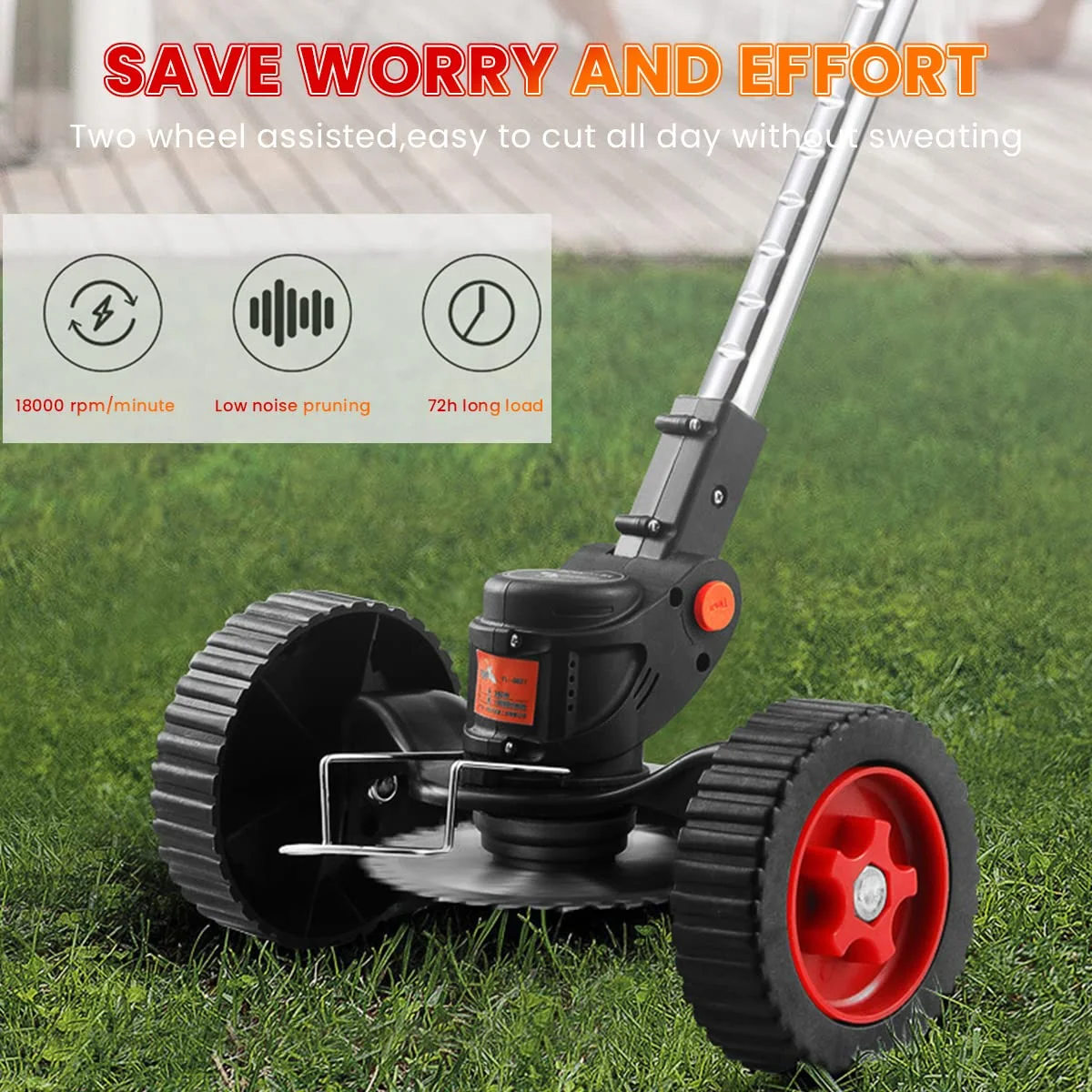 ● -La primera desmalezadora inalámbrica, bordeadora de césped, cortadora de césped, 3 en 1, agrega ruedas de entrenamiento sobre la base original, sin necesidad de agacharse para cortar, operación con una mano, lo que hace que la jardinería sea más fácil.