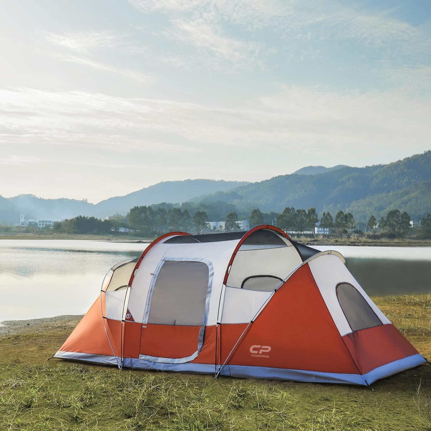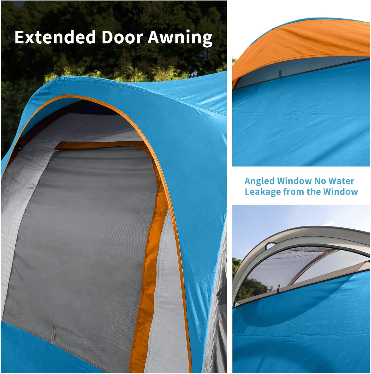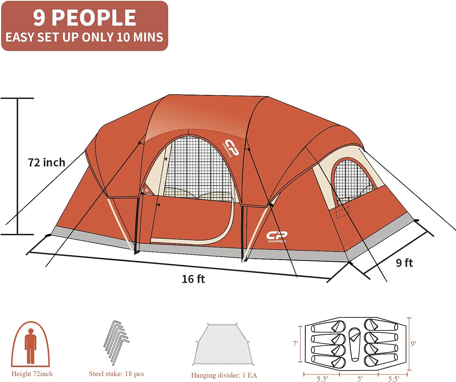 CAMPROS CP - Tienda de campaña para 9 personas, impermeable, resistente al viento, con tapa de lluvia, 4 ventanas de malla grandes, divisor de habitación, fácil de instalar, portátil con bolsa de transporte, color azul