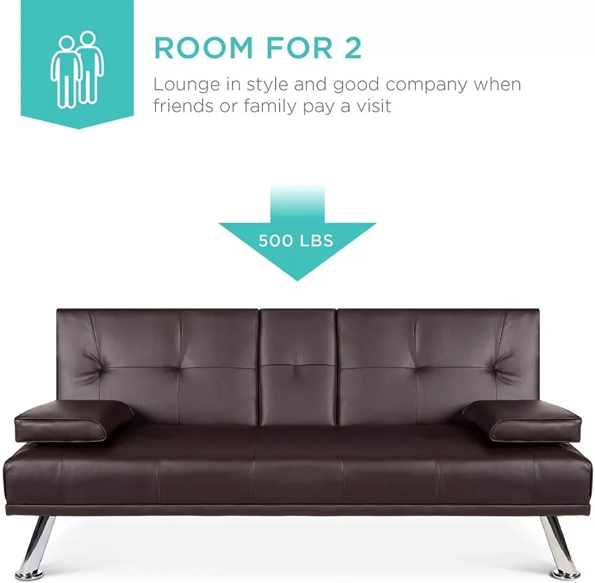 Habitación para 2: este elegante sofá futón tiene un límite de peso de 500 libras que te permite descansar en buena compañía mientras utilizas un reposabrazos plegable con prácticos portavasos en el medio