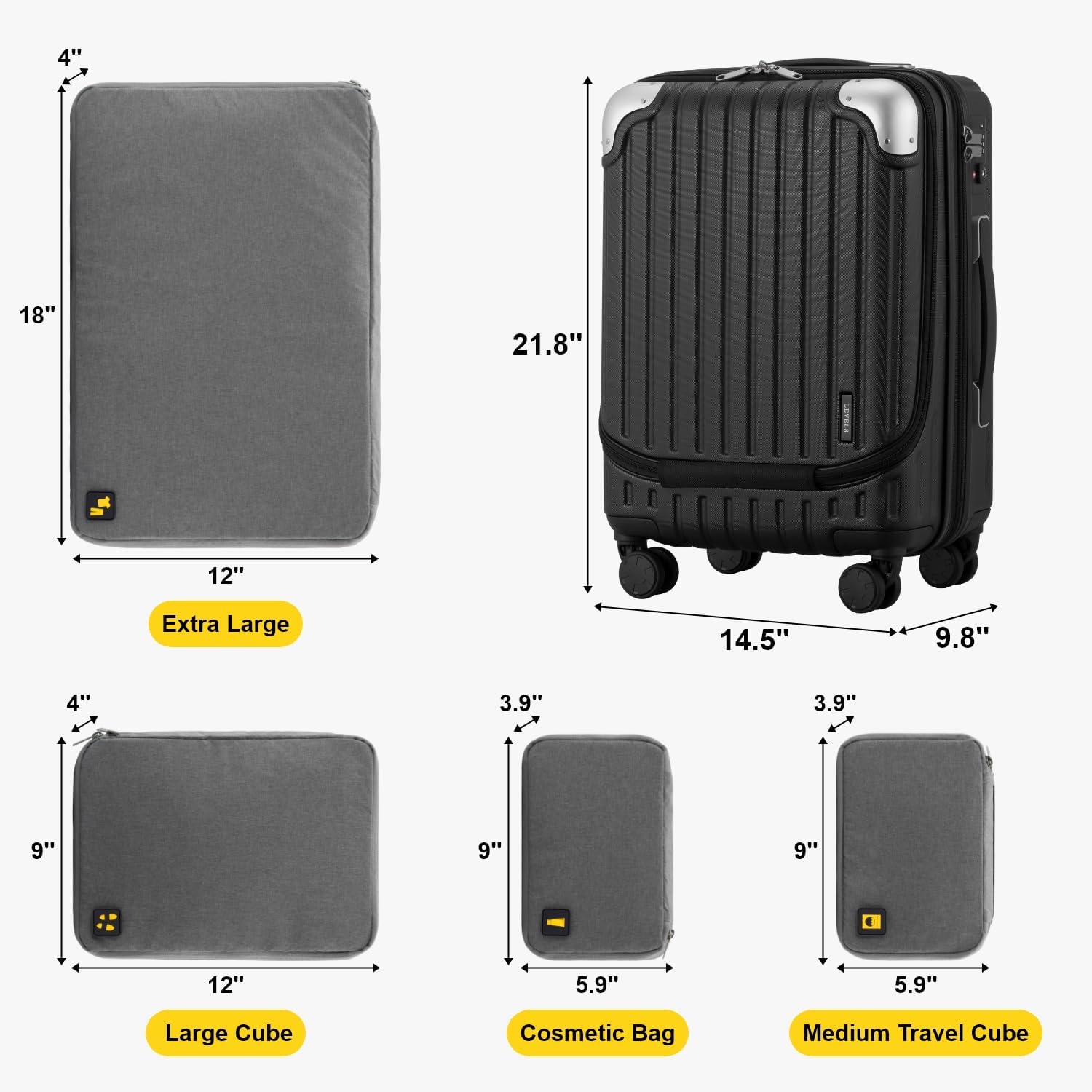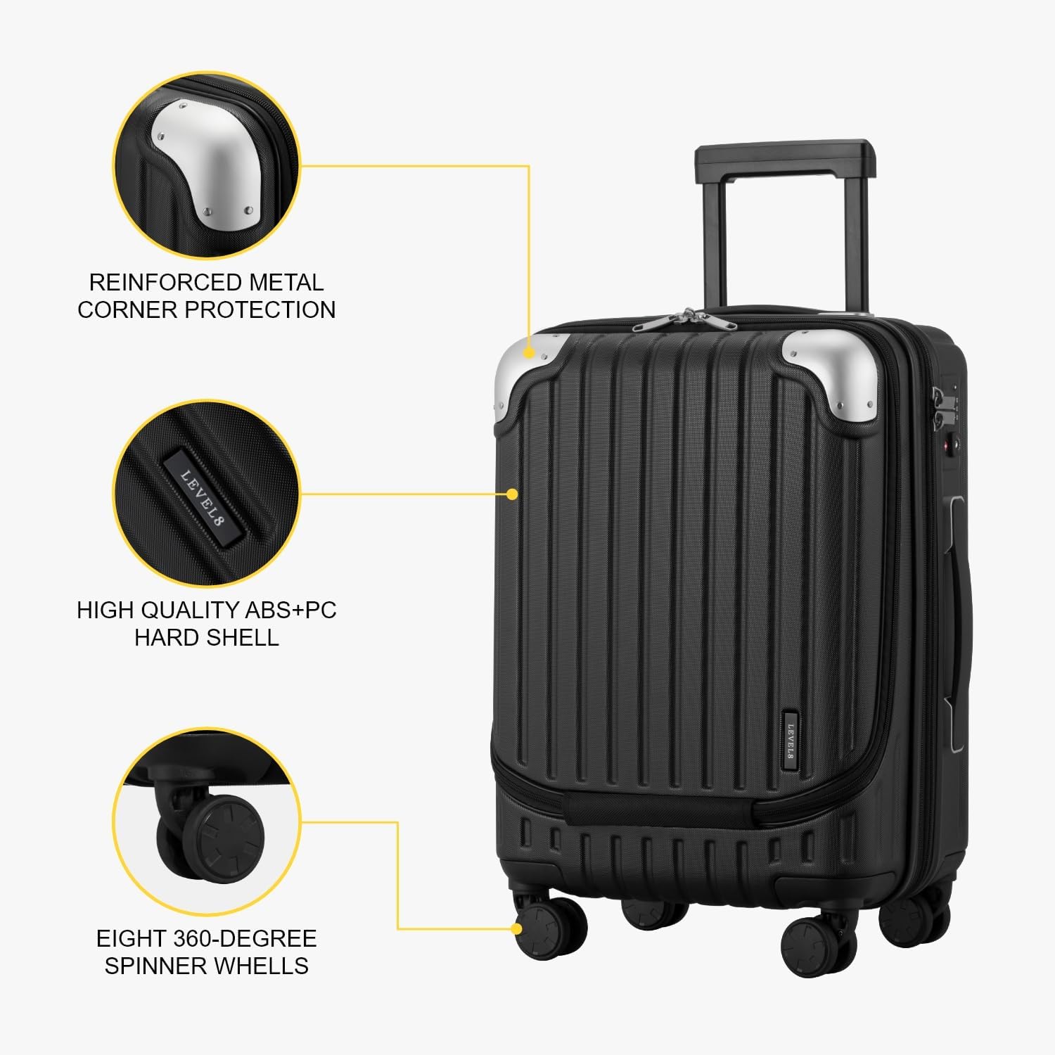 Tamaño de equipaje de mano de 50 cm Compartimento frontal para portátil ABS+materiales de policarbonatoRuedas silenciosas cubiertas de gomaCerradura TSA integrada con cremallera YKK. Interior espacioso