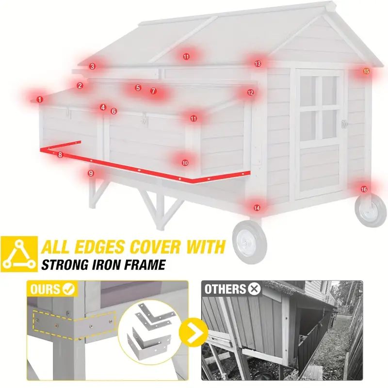 Construcción robusta: diseño único de Aivituvin: cada esquina del gallinero está fortificada con un resistente refuerzo de esquina de metal, lo que eleva la integridad estructural de todo el gallinero. Esto asegura estabilidad y resistencia, resistiendo los elementos y proporcionando un refugio seguro para sus pollos.