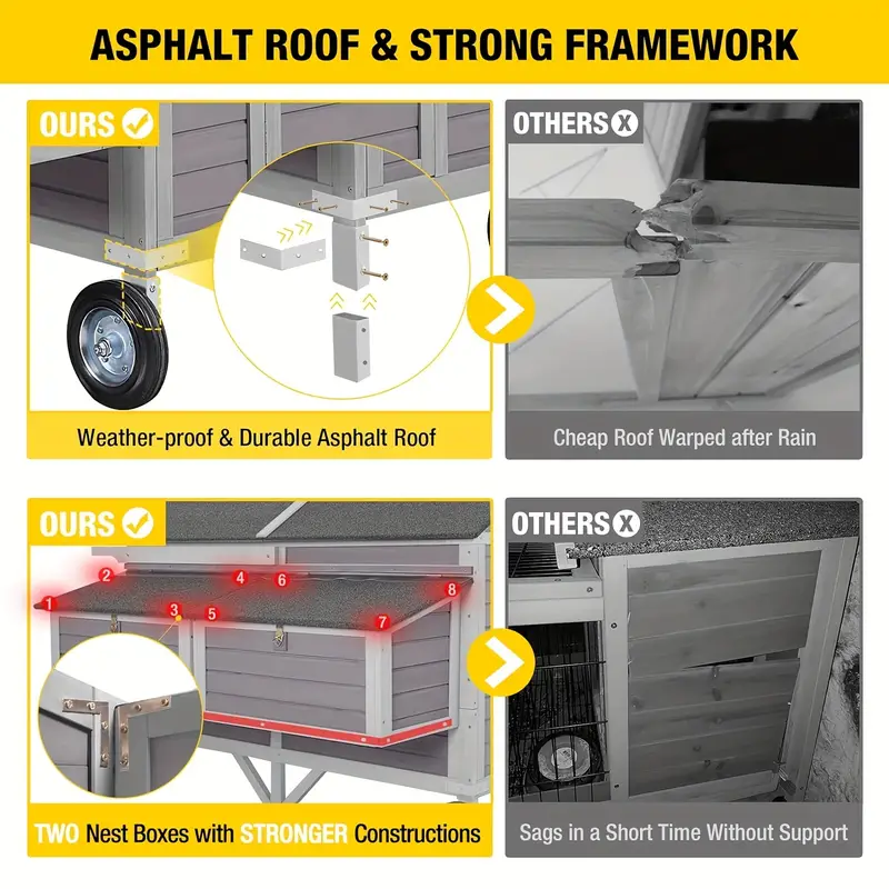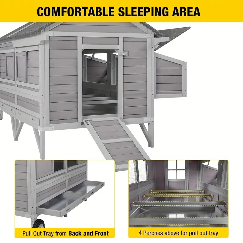 Movilidad mejorada: Equipado con ruedas de gran tamaño, este gallinero se destaca del resto. Las ruedas grandes, más grandes que otras en el mercado, hacen que la reubicación sea muy sencilla. Mueva fácilmente su gallinero a través de varios terrenos con una facilidad incomparable.