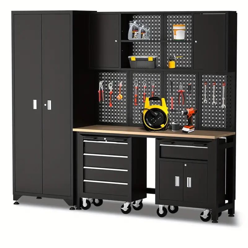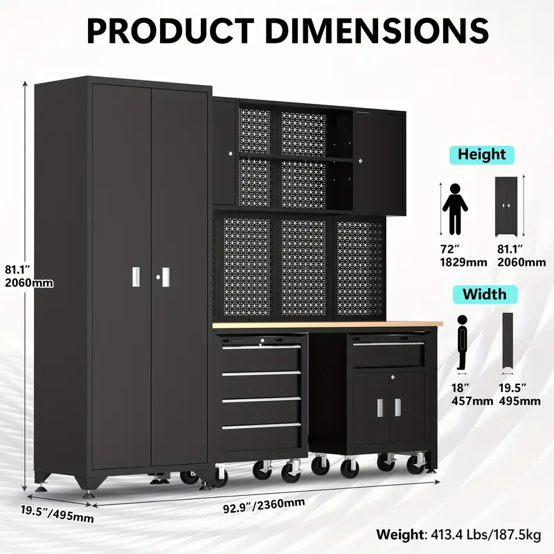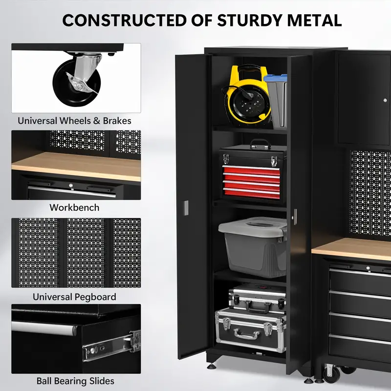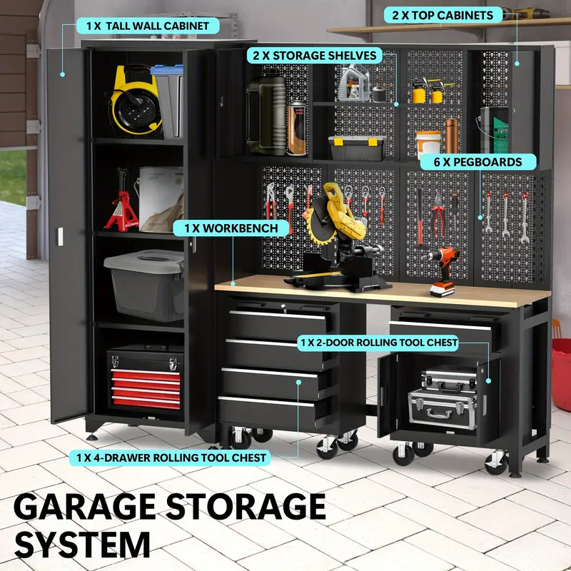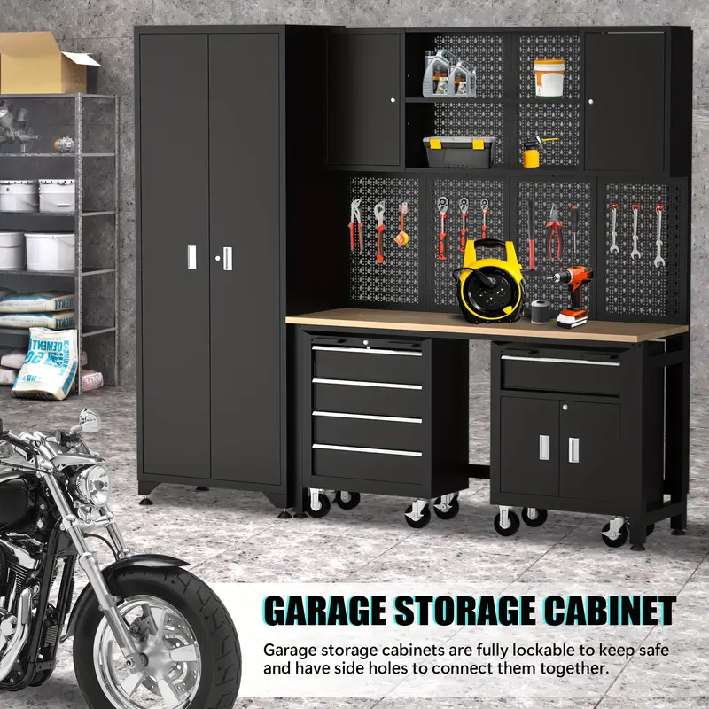 【Sistema de almacenamiento de garaje】El tamaño del juego de gabinetes de almacenamiento de garaje es de 92.9"L X19.5"Dx 81.1"H pulgadas. Incluye un gabinete de almacenamiento alto, un gabinete superior, una mesa de trabajo, un cofre de herramientas rodante de 2 puertas, un cofre de herramientas rodante de 4 cajones y tableros de clavijas. Todos los gabinetes de almacenamiento de garaje son completamente bloqueables para mantener la seguridad y tienen orificios laterales para conectarlos con menos esfuerzo, satisfaciendo sus diferentes necesidades de almacenamiento.