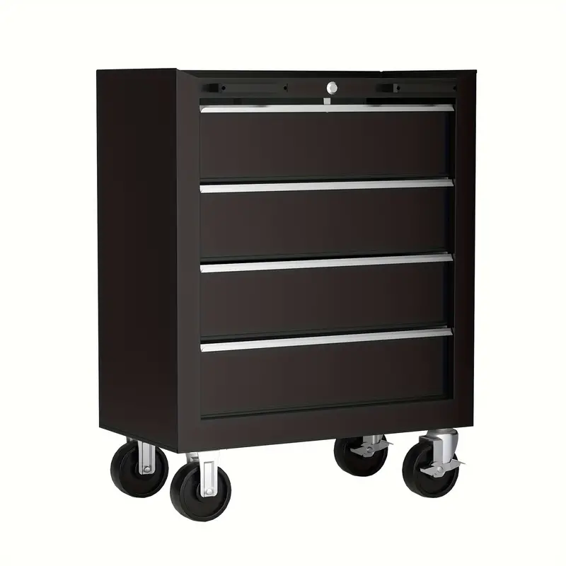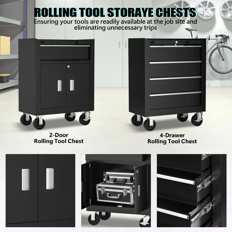 【Dos cofres rodantes】Los cofres rodantes de herramientas de 2 puertas y 4 cajones cuentan con ruedas duraderas de deslizamiento suave, lo que garantiza que sus herramientas estén disponibles en el lugar de trabajo y elimina los viajes innecesarios.