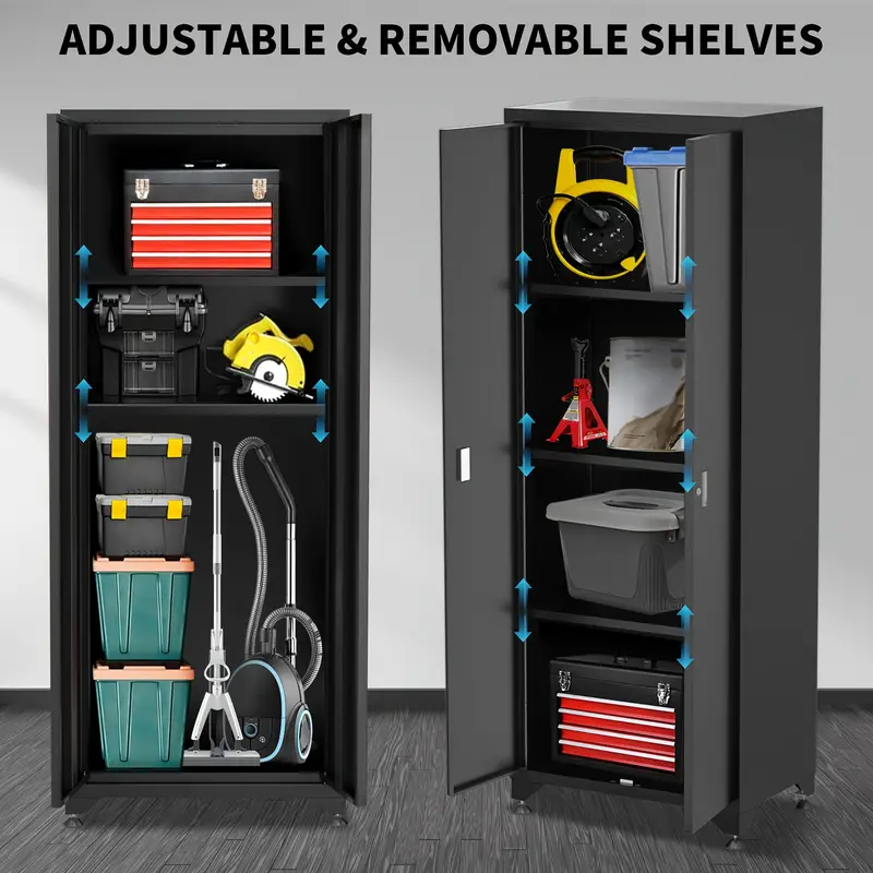 【Gabinete espacioso】Gabinete de organización de garaje con cerradura con 2 puertas y 3 estantes ajustables. El gabinete de almacenamiento alto cuenta con estantes ajustables y extraíbles, capaces de contener de todo, desde herramientas eléctricas hasta suministros a granel.