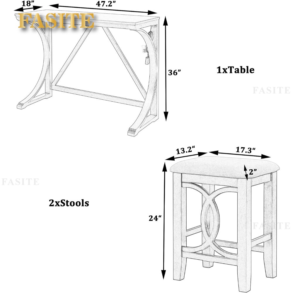 【Dimensiones de los juegos de comedor】: Mesa: 47,2 x 18 x 36 pulgadas (largo x ancho x alto); Grosor de la superficie: 0,7 pulgadas; Taburete de comedor: 17,3 x 1 3,2 x 24 pulgadas; Grosor del cojín: 2 pulgadas. Garantía de 12 meses. Aviso: