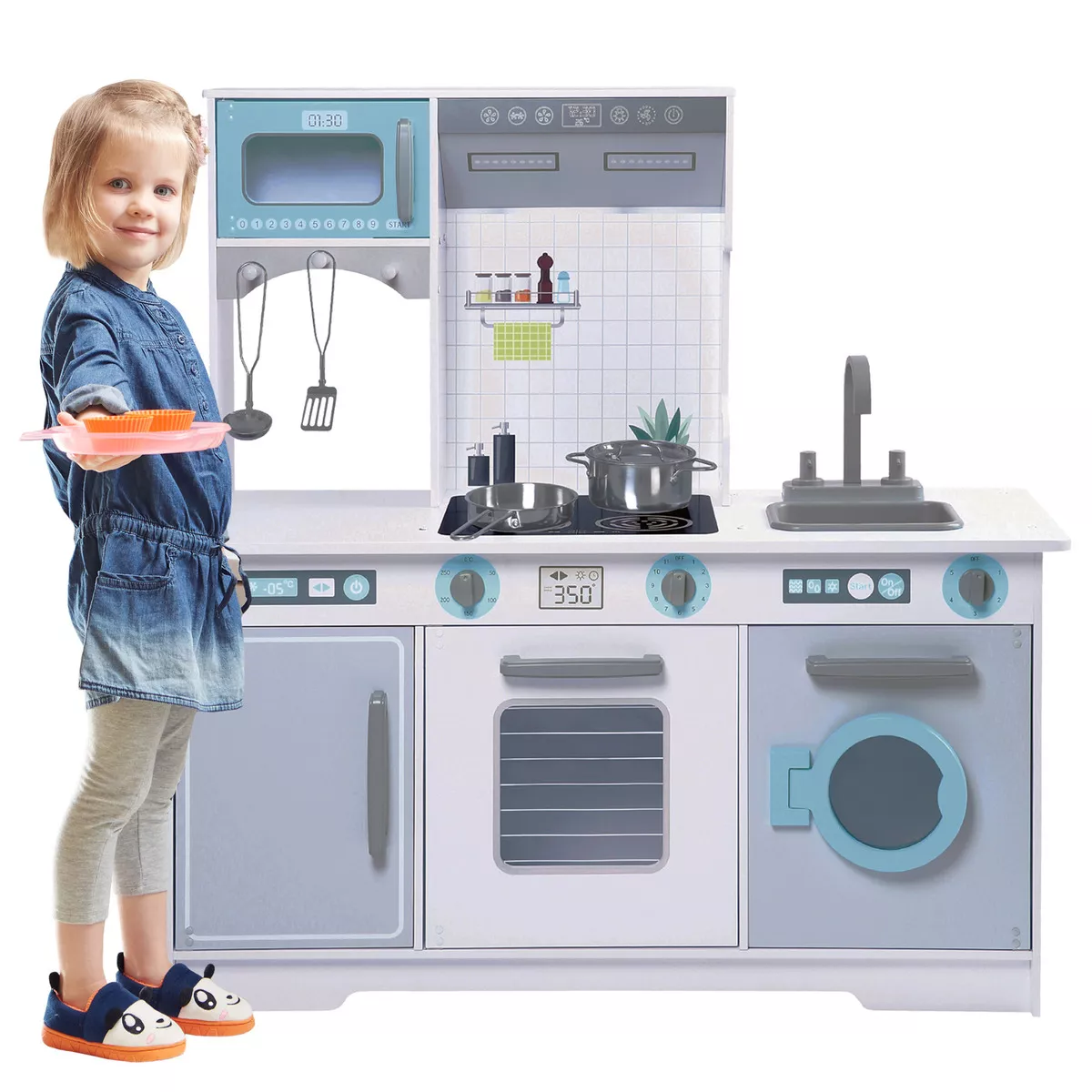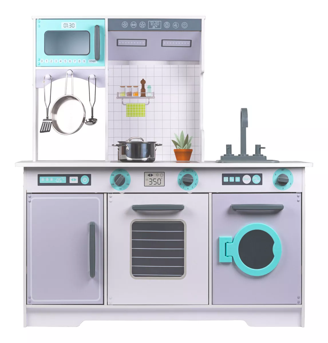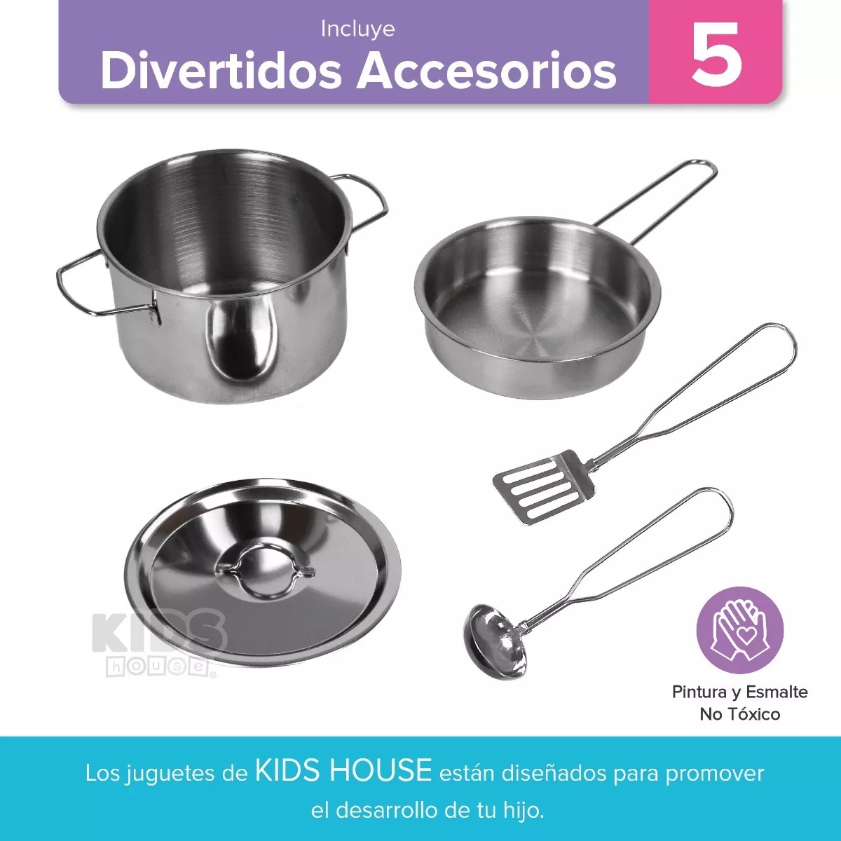 Incluye accesorios como una espátula, una cuchara, una olla y una sartén, para que los niños puedan jugar y cocinar como los adultos. Además, cuenta con un horno incorporado, para que puedan hornear sus creaciones.