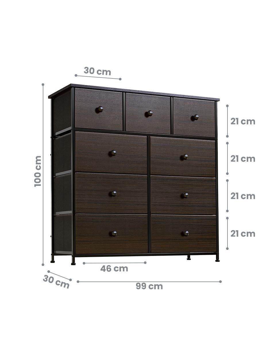 Esta cómoda se puede utilizar en varias habitaciones, es ideal para armarios, lavandería, dormitorios, sala de estar, pasillo, guardería, salas de juegos, entradas, dormitorio universitario, oficina. El marco de acero resistente y la encimera impermeable de madera MDF duradera proporciona una resistencia y estabilidad confiable y duradera. Las patas ajustables se pueden utilizar en suelos no inclinados para aumentar la estabilidad y proteger contra arañazos en el suelo. La parte delantera está hecha de materiales catiónicos, y todos los demás lados y huecos están hechos de fibras sintéticas no tejidas transpirables de alta calidad. La torre de almacenamiento con 9 cajones separados te ayuda a ordenar tus artículos los cajones plegables incluyen 2 tamaños para satisfacer tus diferentes necesidades de almacenamiento. Los cajones son ideales para organizar tu ropa, mantas, bufandas, calcetines y otros accesorios. Úsalo dentro o fuera del armario y mantén el desorden bajo control almacenando toda tu ropa y accesorios en un lugar conveniente. La parte superior de madera proporciona una superficie dura para colocar lámparas, libros, decoración y mucho más. Elegante mango de madera en los cajones para abrir y cerrar más fácilmente. Las asas laterales elevadas hacen que sea fácilmente portátil para que puedas moverlo en cualquier momento. Si tienes alguna pregunta sobre el producto, no dudes en ponerte en contacto con nosotros, te responderemos a la mayor brevedad posible