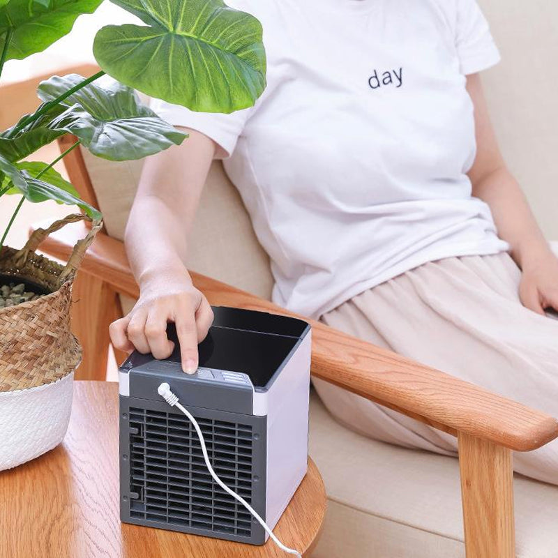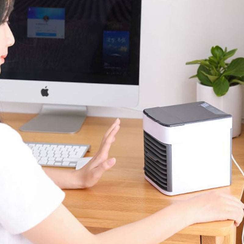 Enfriador de aire acondicionado ideal para escritorio, tiene conexión USB y puedes llenarlo con agua fría para mejorar tu experiencia y generar un aire mucho más frío y refrescante. También puedes agregar tus esencias favoritas al agua para que llene tus espacios con aroma y purifique tu aire. Tiene distintas intensidades y puedes cambiar la dirección del aire como tu quieres.
