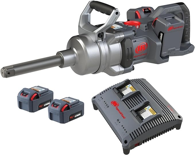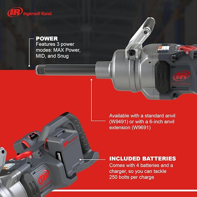 Ingersoll Rand W9691-K4E Kit de batería de 1" Llave de impacto inalámbrica de 20V 4, zanco ext de 6", torque de 3000 ft-lb, retenedor de orificio pasante de anillo de fricción, mango en D-llave de impacto