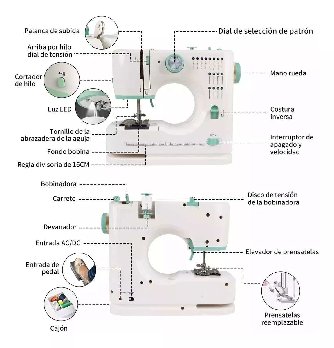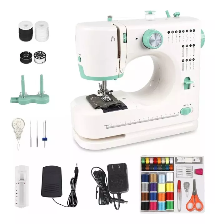 La mini máquina de coser recientemente mejorada tiene una variedad de funciones íntimas y prácticas: cortador tangencial, iluminación LED, pedal, cajón de almacenamiento, función de bobinado, ajuste elástico del hilo superior, función de puntada inversa, control de doble interruptor; Puedes reemplazar fácilmente el prensatelas de metal o coser un botón y un ojal etc.