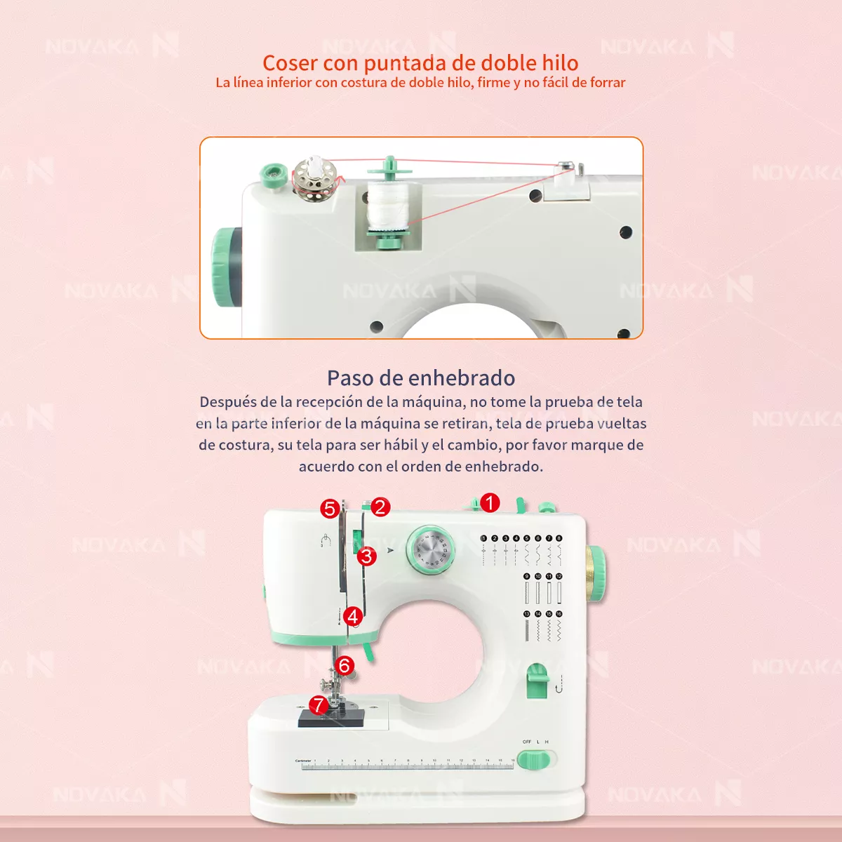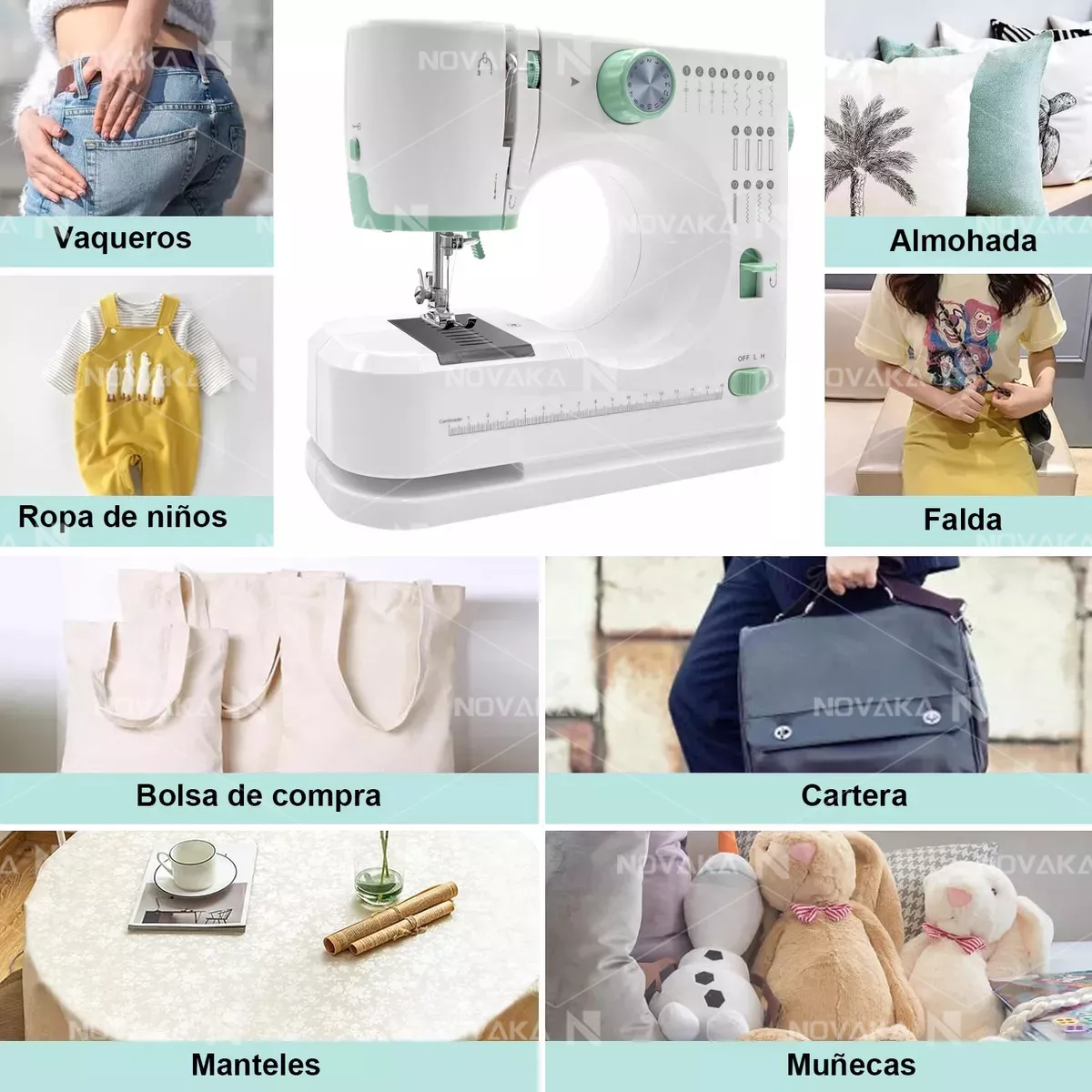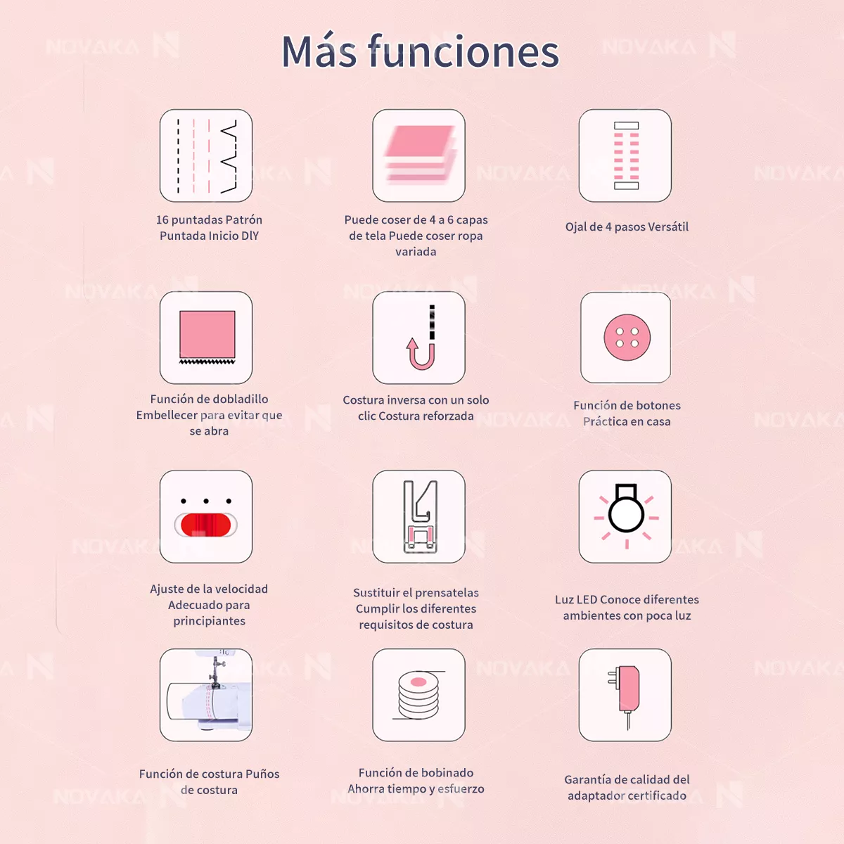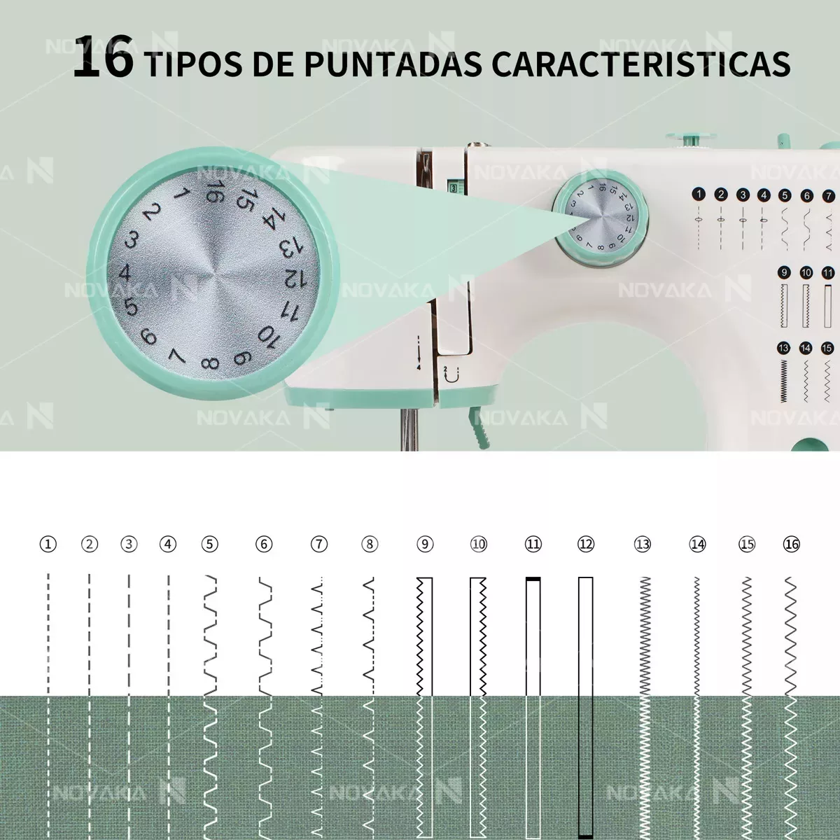 16 puntadas para diferentes proyectos de costura, incluyendo puntada recta, puntada en zigzag, puntada de ojal, puntada overlock y más. Satisface sus necesidades de costura DIY: decoración del hogar, manualidades, vestidos de fiesta, ropa para mascotas, etc., para hacer su vida más colorida.