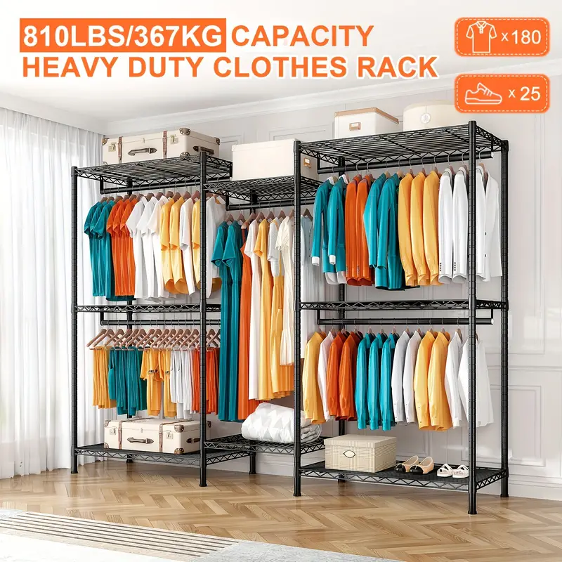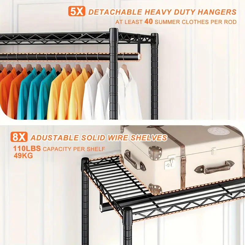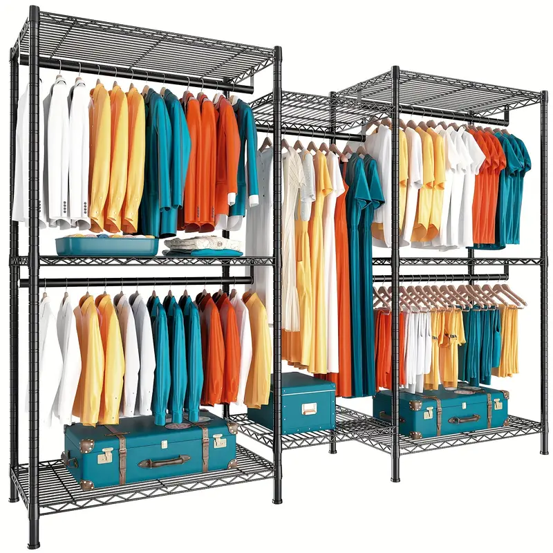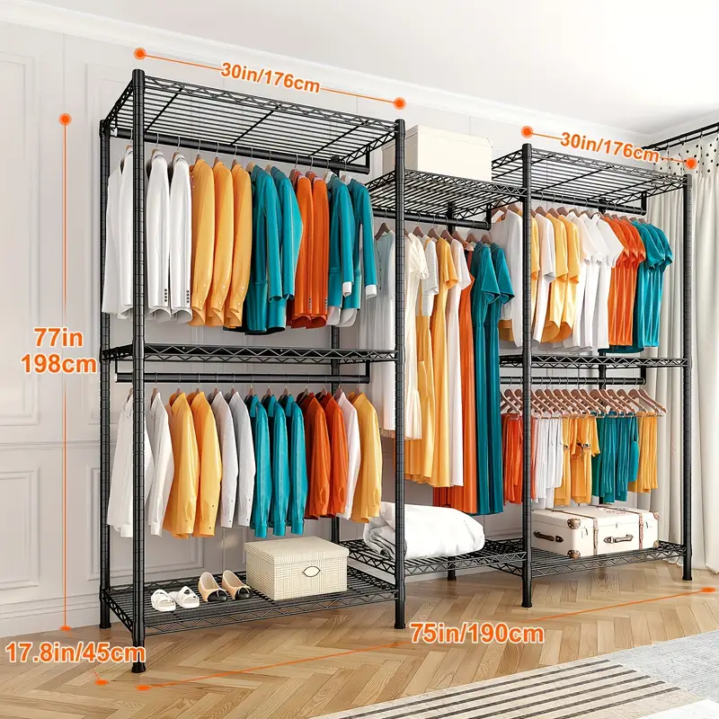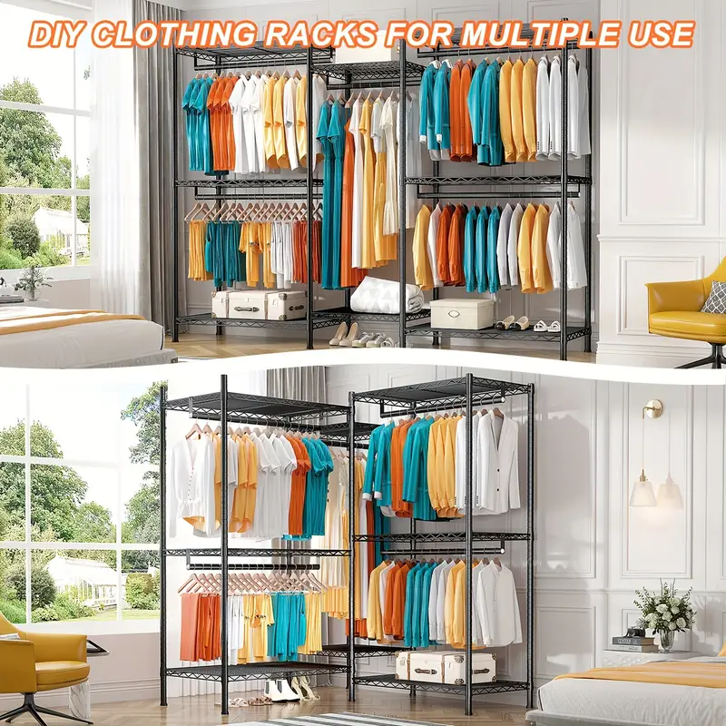 【Gran ahorro de espacio】Dimensiones: 74.5" W X 18" D X 77" H. Suficientes 5 barras de ropa para sus necesidades. Almacenamiento de armario adicional, más un estante para colgar ropa larga. Puedes colgar toda la ropa de tu familia. También hay un estante en la parte superior que puedes usar para guardar bufandas, lazos, cinturones, etc. Maximiza el espacio para colocar tus cosas y mantener tu hogar limpio todo el tiempo. 【En forma de L para la esquina】El perchero tiene 2 métodos de instalación diferentes para habitaciones de diferentes tamaños. Forma de L para espacios pequeños como esquinas, apartamentos, etc. Forma de I para habitaciones más grandes. Puedes elegir la forma que mejor se adapte a tu espacio.