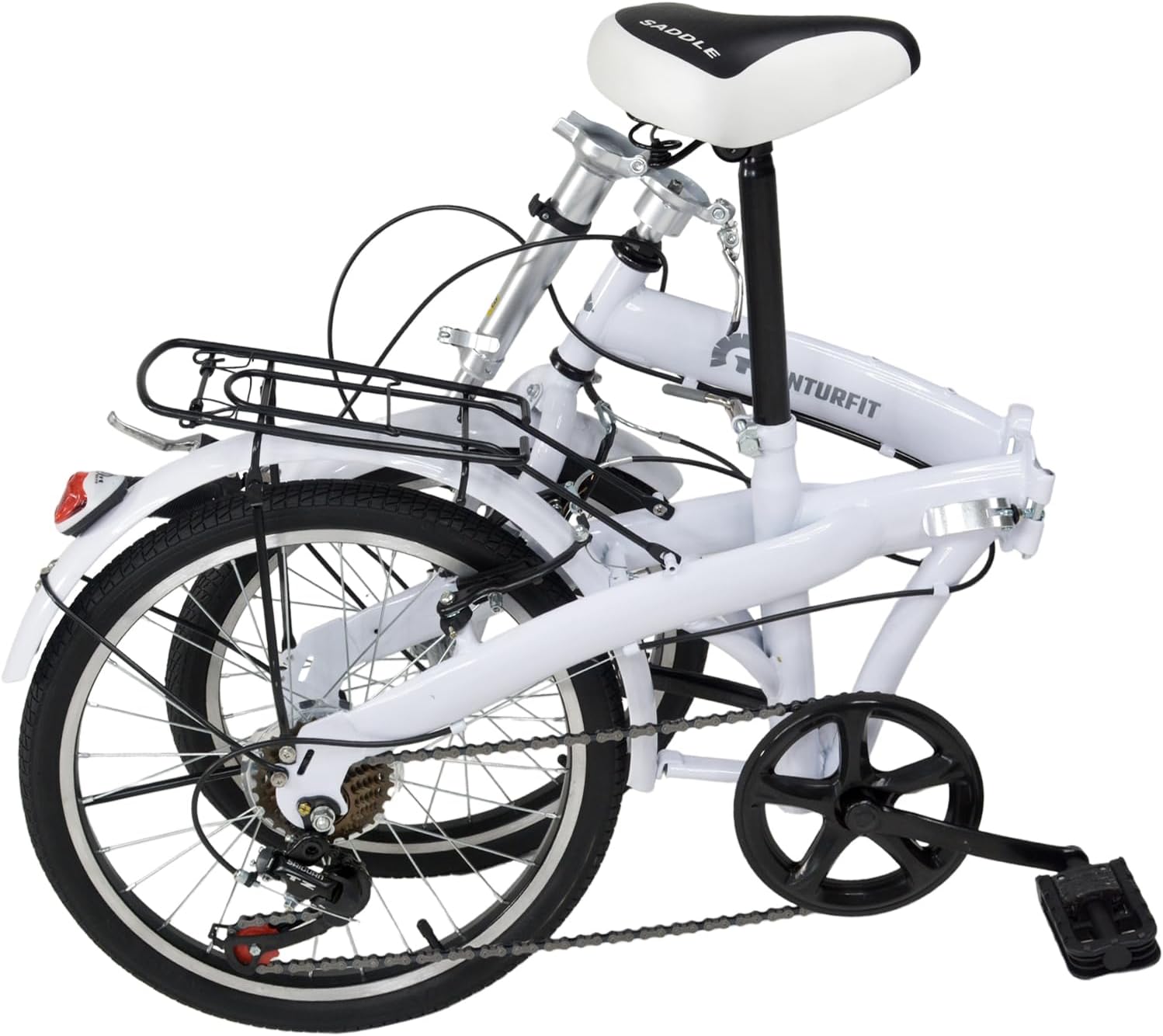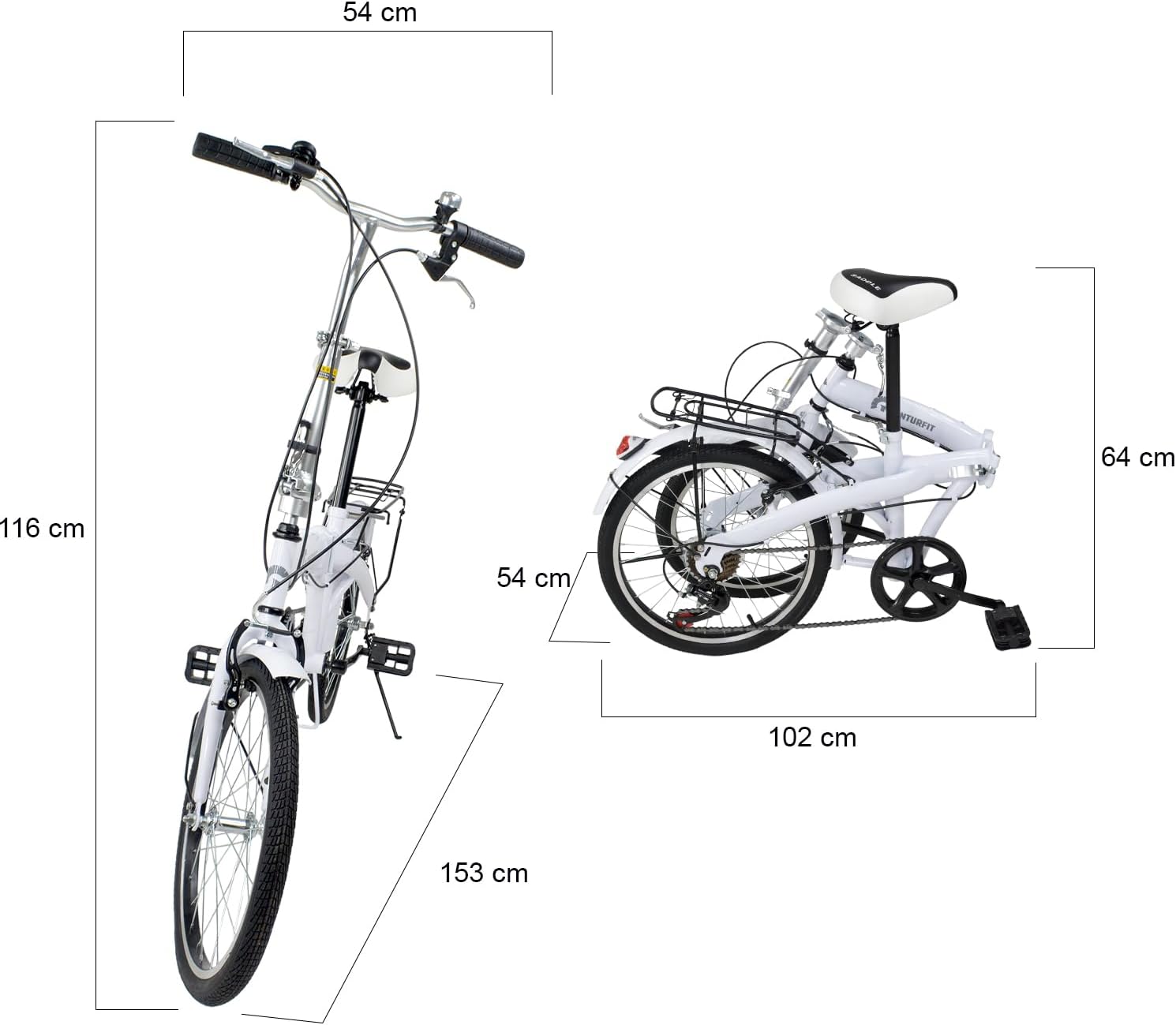 [Bicicleta plegable de ciudad] [Frenos V BRAKES] [7 ajustes de velocidad] DATOS TÉCNICOS Características de las ruedas - 20 pulgadas-50 cm - Grosor 3.7 cm - Inflar máximo a 40 psi - 20 x 175 Velocidades: 7 Altura de manubrio - Máxima: 116 cm - Mínima: 100 cm Altura del asiento: - Máxima: 90 cm - Mínima: 67 cm Altura máxima del usuario: 180 cm Frenos V BREAKES Herramientas necesarias para el armado (no incluidas): - Juego de llaves Allen - Llave inglesa ajustable o - Llave española - Pinzas Medidas de los pedales: 9.5 X 7 cm Numero de pliegues: 2 cuadros y manubrio plegable Medidas de la parrilla: 31.5 X 17.5 X 26 cm Medidas de eje a eje: 102 cm INCLUYE - Bicicleta semi armada con rueda trasera - Manubrio - Asiento - Rueda delantera - Salpicadera - Pedales MEDIDAS DEL PRODUCTO Largo: 153 cm Ancho: 54 cm Alto: 116 cm PESO DEL PRODUCTO 14.3 kg MEDIDAS DEL EMPAQUE Largo: 136 cm Ancho: 23 cm Alto: 72 cm PESO DEL PRODUCTO EMPACADO 16 kg