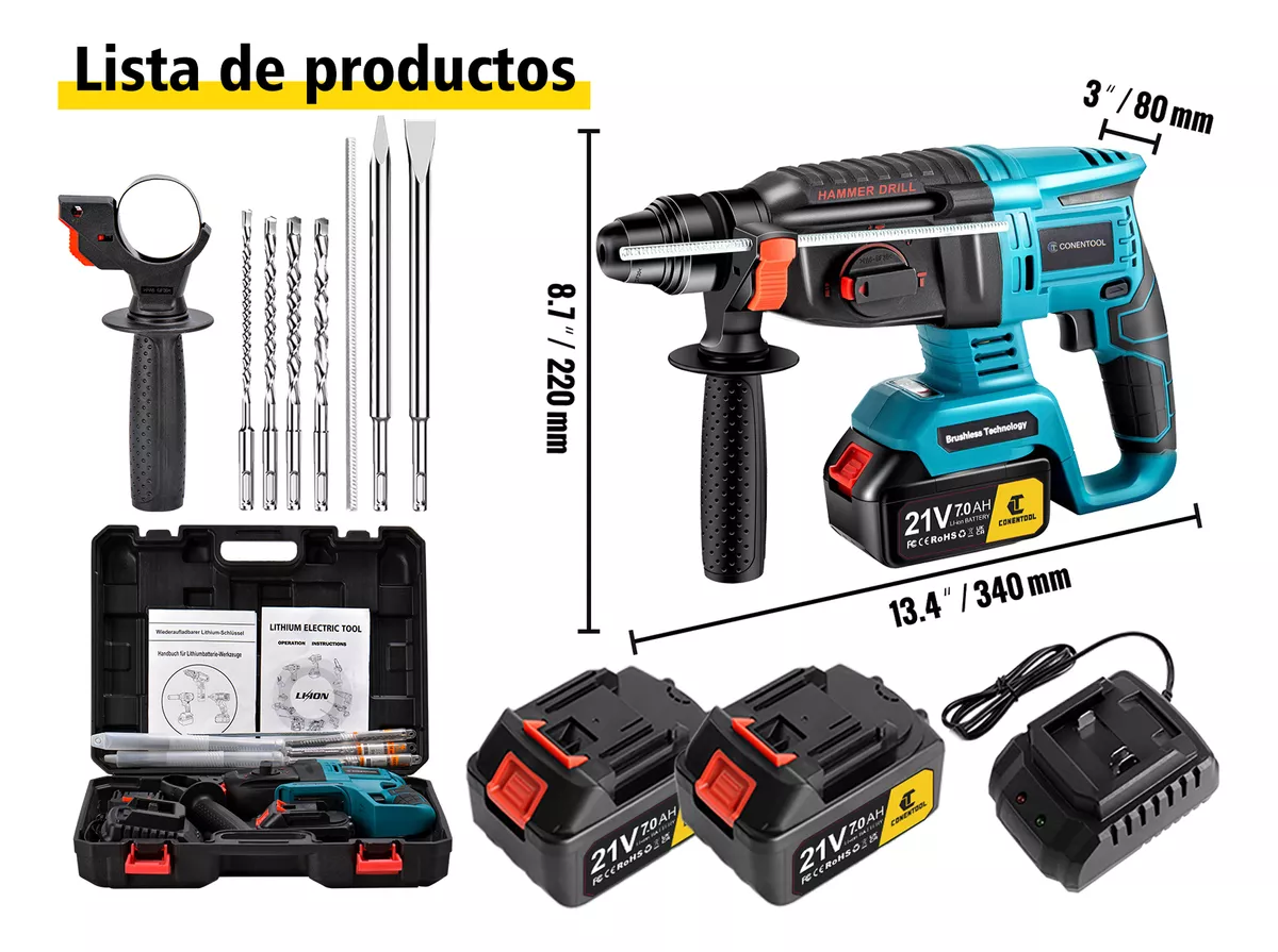1 * martillo eléctrico, 1 * caja de plástico, 1 * cincel plano de martillo ligero, 1 *manual de usuario., 2*baterías, 1 *cargador |