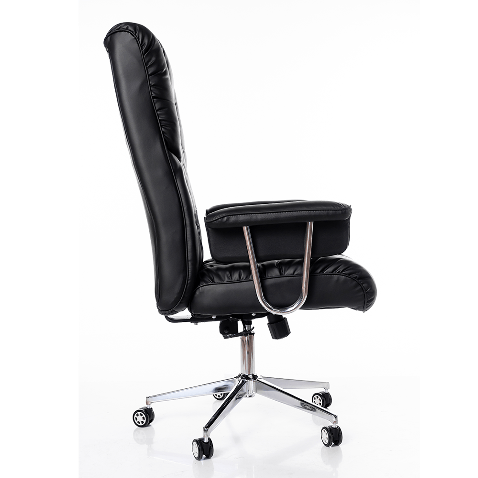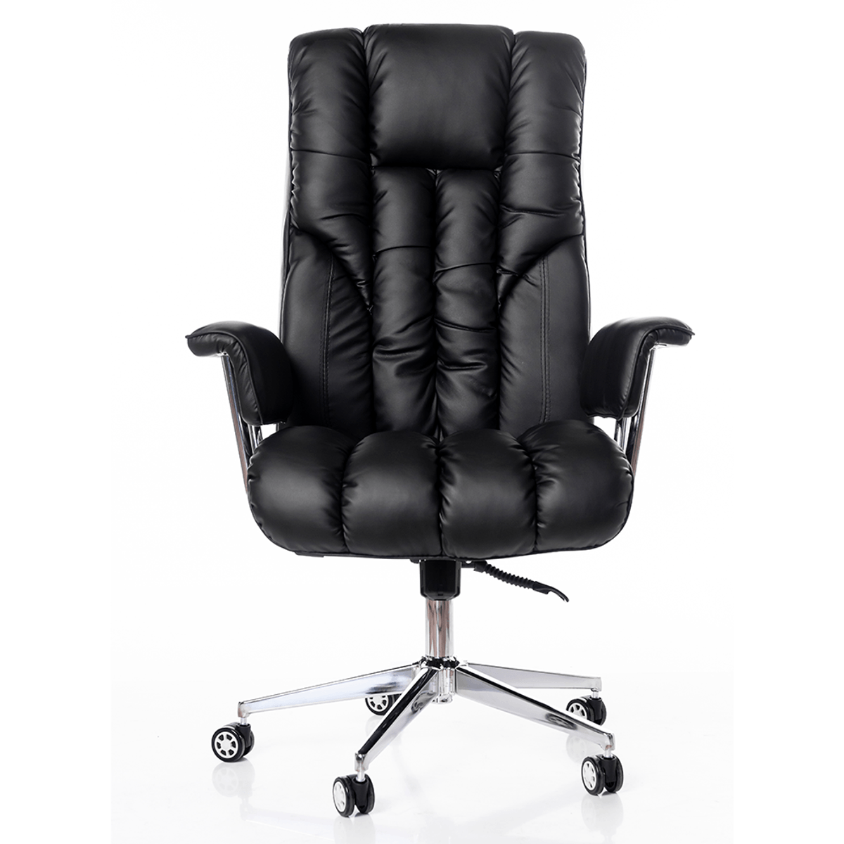 Está diseñada para ofrecer un soporte óptimo a la espalda y la columna vertebral. Su respaldo reclinable hasta 120 grados permite ajustar la inclinación según las necesidades del usuario, promoviendo una postura correcta y reduciendo el riesgo de problemas musculoesqueléticos. Fabricada con materiales de alta calidad, que incluyen una base robusta de metal y ruedas silenciosas que permiten una movilidad suave y sin esfuerzo. La tapicería de cuero sintético negro añade un toque de elegancia y profesionalismo, haciendo que esta silla sea ideal para cualquier oficina moderna.