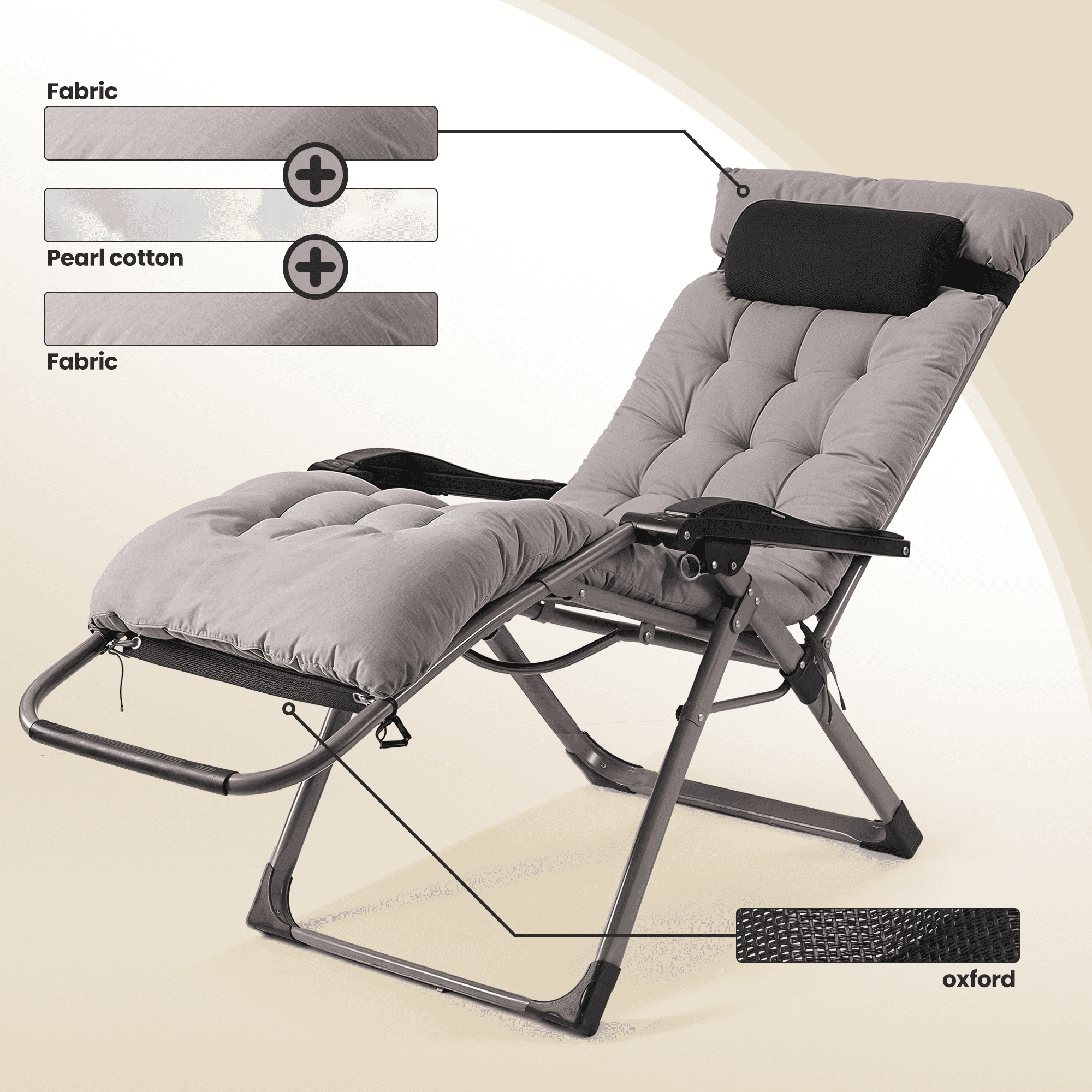 【Material Premium y Capacidad Máxima de Peso de 160 kg】Esta silla de gravedad cero extragrande y mejorada está diseñada para soportar hasta 160 kg. Los tubos de acero de 40 mm (1,6 pulgadas) de grosor garantizan que la silla se mantenga estable y sin tambalearse, mejorando su capacidad de carga y durabilidad, siendo especialmente adecuada para usar en patios exteriores. La tela texlin mejorada, las correas elásticas dobles, la malla transpirable y los cojines extraíbles proporcionan mayor comodidad.