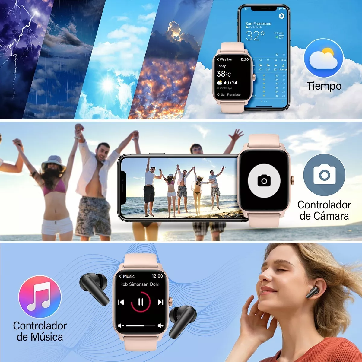 Funciones: Control de cámara, Linterna, Buscar teléfono, Contestar llamada, Control de música (Spotify/Música de Youtube), Asistente de voz de Alexa, Más de 100 modos deportivos, Rastreador de actividad, Ritmo cardíaco en tiempo real/Oxígeno en sangre/Monitoreo de estrés, Monitoreo de ritmo cardíaco durante el sueño , entrenamiento de respiración, notificación de mensajes, resistente al agua 68, despertador, cronómetro, recordatorio de agua sedentaria/bebible, clima, etc.