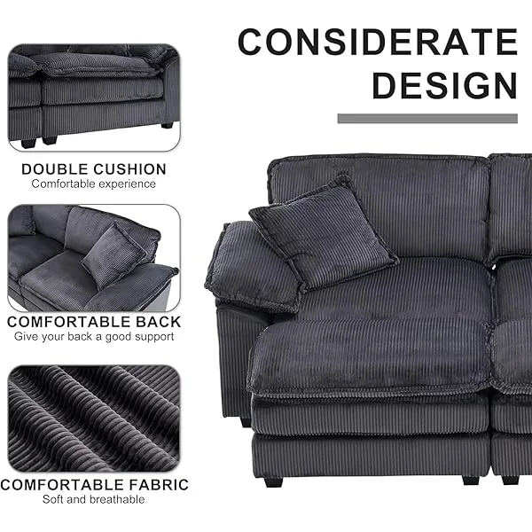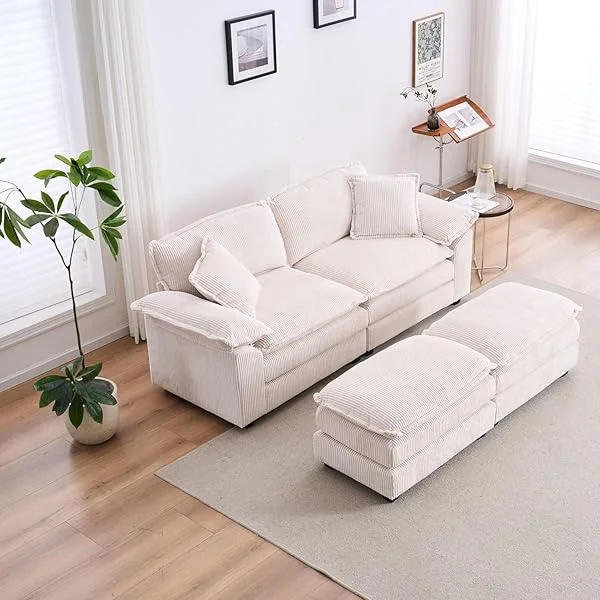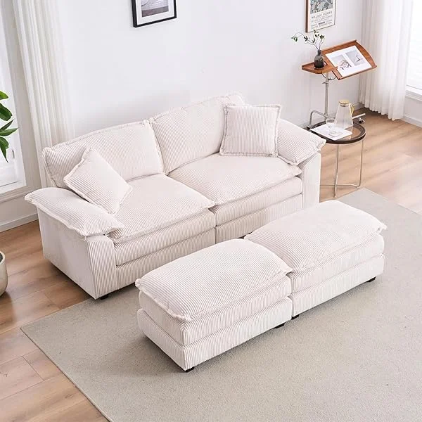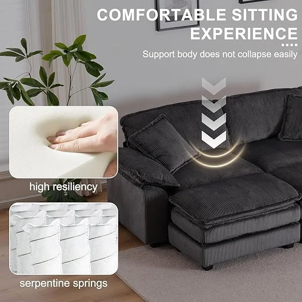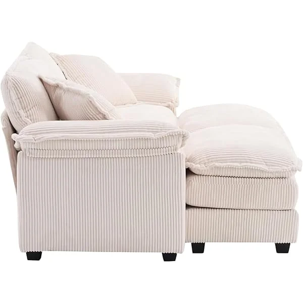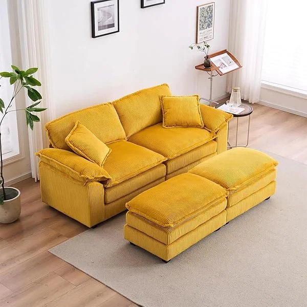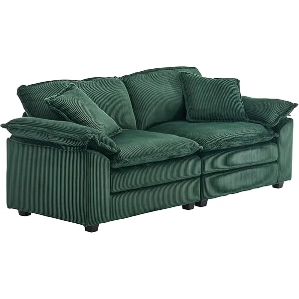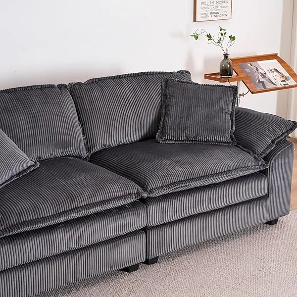 【Fácil montaje】Mide 84,6" de largo x 56,3" de ancho x 34,3" de alto, el sofá incluye instrucciones claras y herramientas para un montaje rápido y sencillo. 【Diseño modular】Ideal para reuniones familiares, siestas o momentos de calidad con amigos, este elegante sofá de pana enfatiza la durabilidad y la artesanía detallada. 【Incluye 2 almohadas】Viene con dos almohadas de respaldo para mayor apoyo lumbar y comodidad, perfecto para ti y tu pareja. 【Comodidad de pana suave】Tapizado en pana suave y acogedora, este sofá cuenta con una amortiguación de esponja de alta resiliencia reforzada con resortes para una comodidad superior y retención de la xforma. 【Material de alta calidad】Fabricado con un marco de madera maciza para una mayor robustez y durabilidad, lo que garantiza un lugar de descanso confiable después de un día ajetreado.