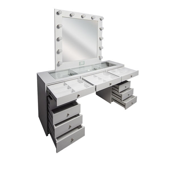 - Tocador Hollywood cuenta con cajones superiores con separadores movibles, iluminación led conformada por 13 focos ahorradores, alrededor del espejo, cuenta con 4 cajones en los laterales izquierda y derecha, cajones con corredera de extensión para facilitar el abrir y cerrar de tus cajones, tambien incluye enchufe y apagador, dale un toque de glamour a tu vida con este maravilloso tocador, el toque sofisticado a tu habitacion. ALTO: 2 m ANCHO: 1.60 m FONDO: 40 cm.