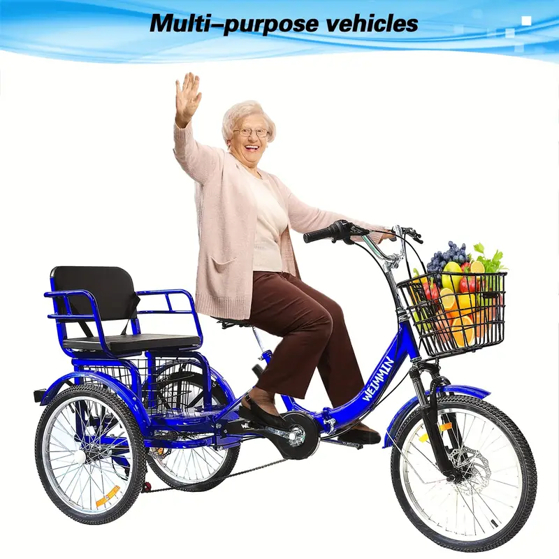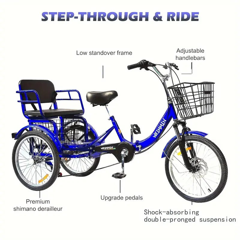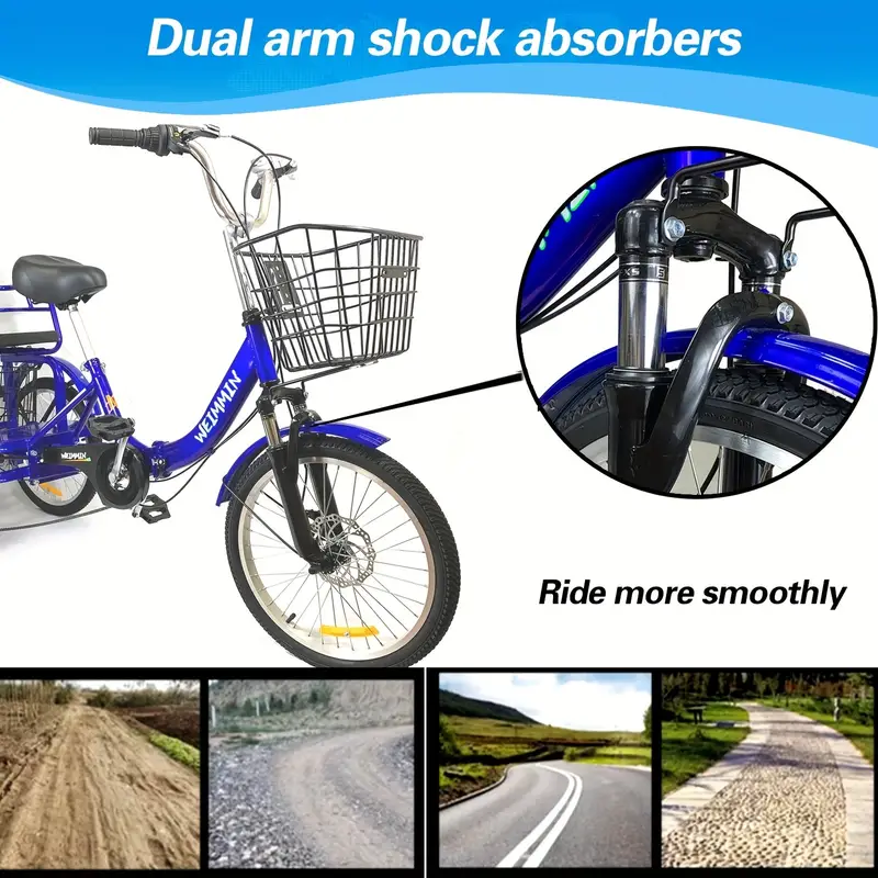 Triciclo para adultos de 7 velocidades, bicicletas de 3 ruedas de 20 pulgadas, triciclo plegable para adultos, para mujeres/hombres/ancianos, bicicleta con rueda de absorción de impactos de horquilla con cesta delantera y trasera para ir de compras.