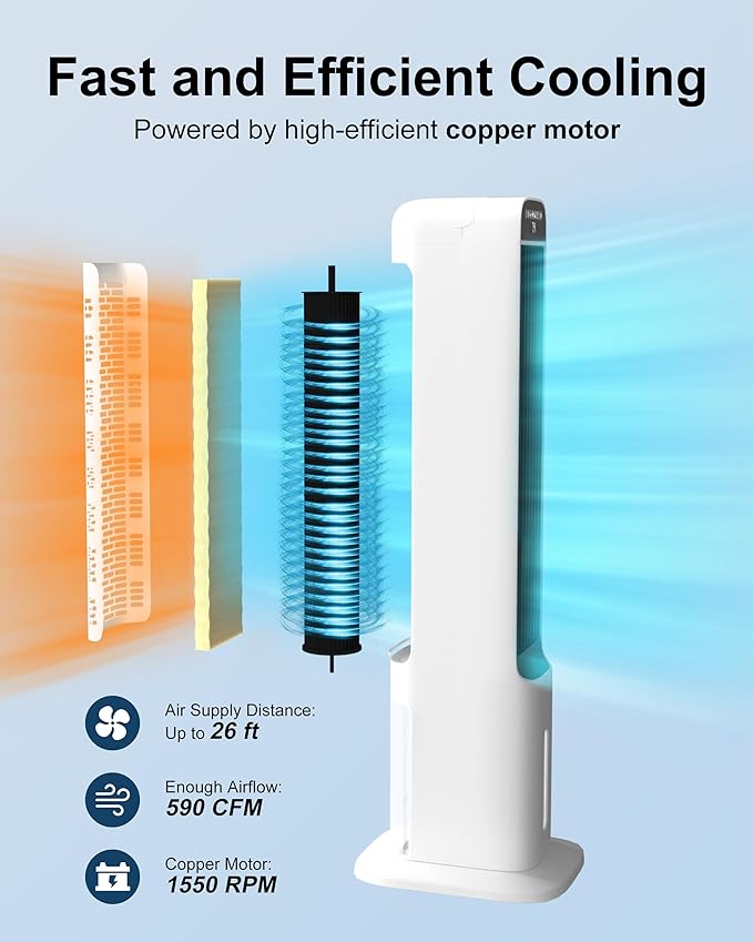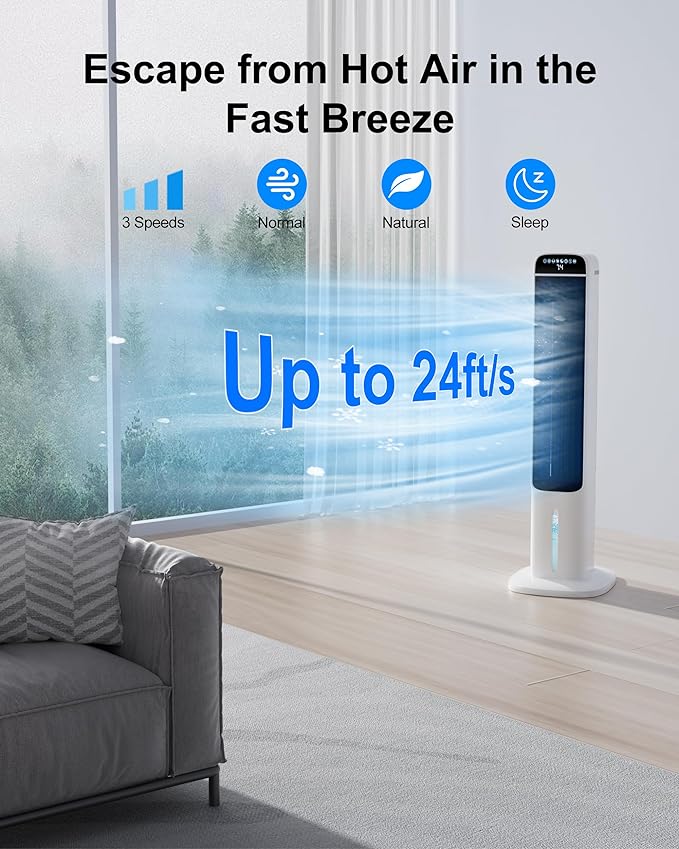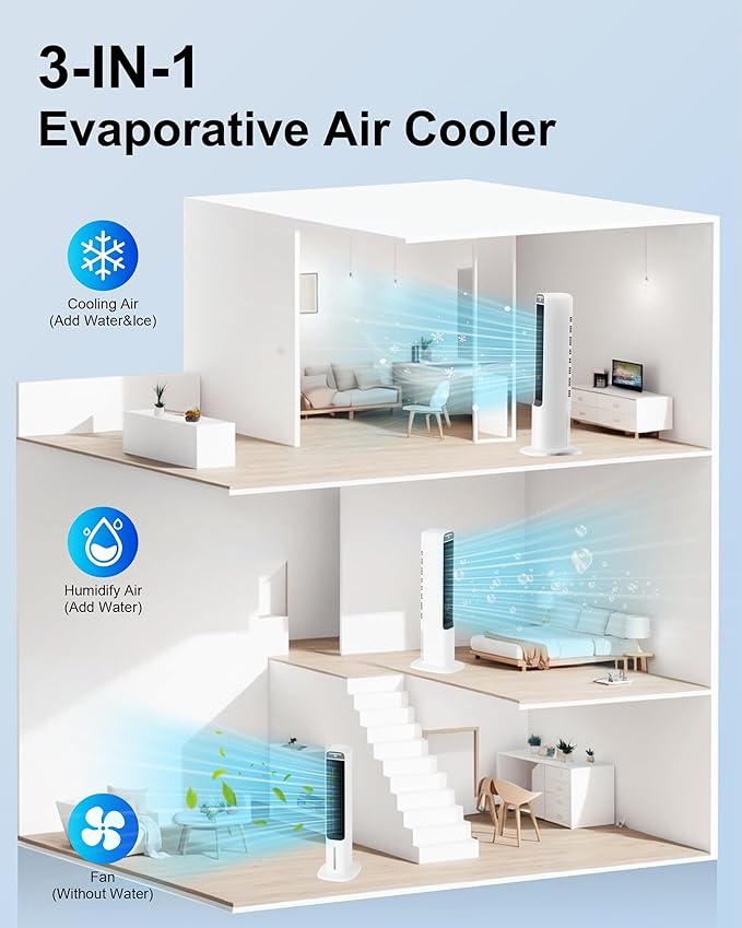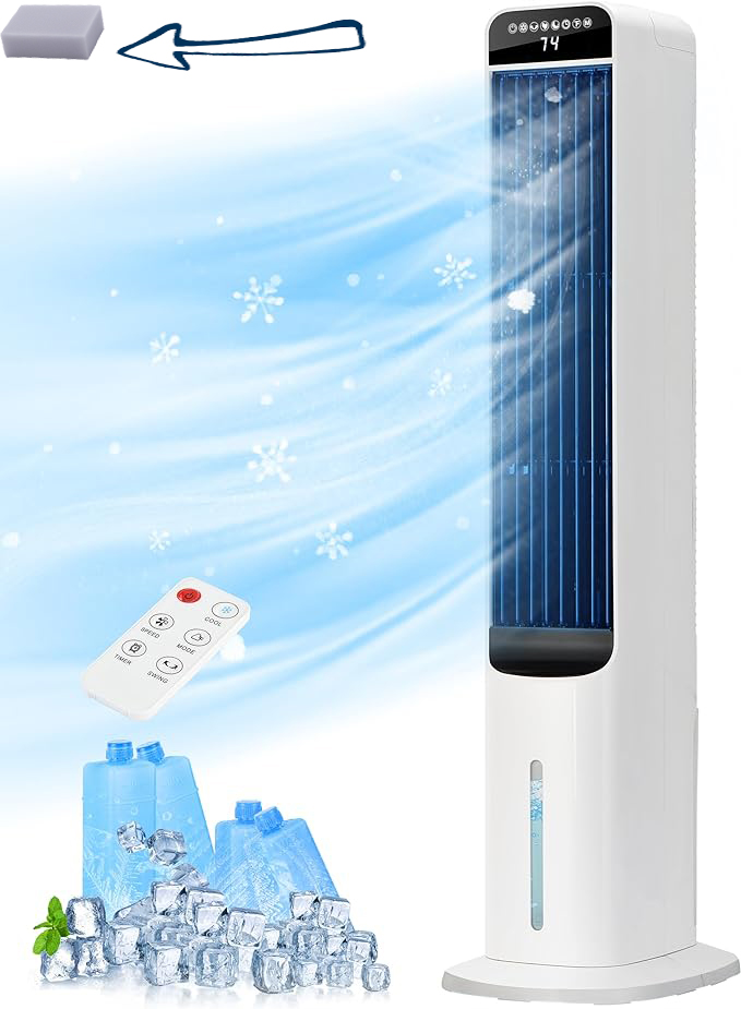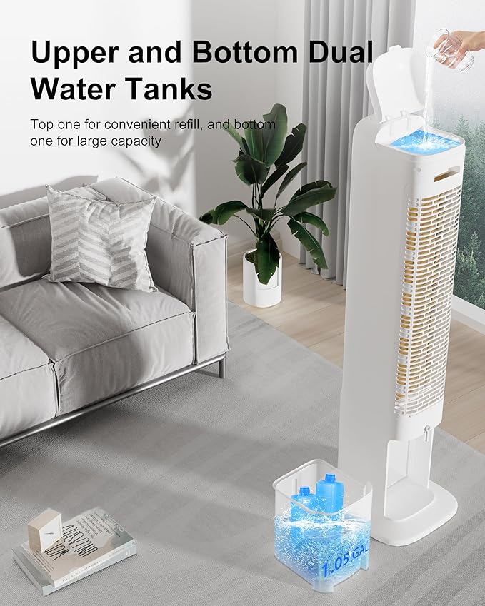 Recomendar su uso en climas secosLos efectos de enfriamiento de los enfriadores de aire provienen de evaporar el vapor de agua en el aire. En lugares con alta humedad ya hay una gran cantidad de humedad en el aire, por lo que mitiga el efecto de enfriamiento. | Abre la ventana mientras usasDe acuerdo con el principio de evaporación de agua y absorción de calor, el agua fluye a través de la almohadilla de enfriamiento de alta densidad, absorbe el calor circundante y se evapora en el aire, por lo que la temperatura del aire circundante cae y la humedad del aire circundante aumenta. Por lo tanto, para evitar que el espacio se humedezca, se recomienda abrir la ventana al usarla, lo que favorece la circulación del aire y un mejor efecto de enfriamiento. | Uso con aire acondicionadoEl enfriador de pantano se coloca con aire acondicionado, que puede formar convección de aire y aumentar la circulación de aire en interiores | Llenar agua en la parte superiorLevanta la cubierta superior para llenar cómodamente el tanque con agua. Viene con 4 cajas de hielo, puedes congelarlas y ponerlas en el tanque para maximizar la refrigeración. |