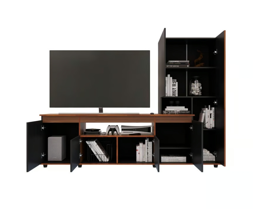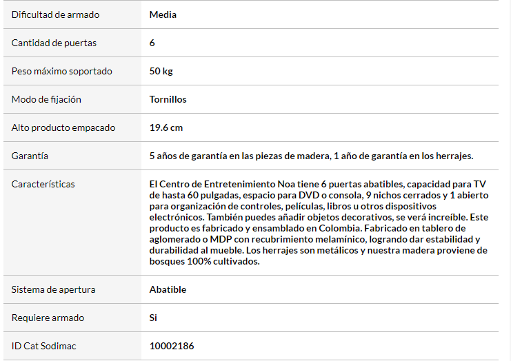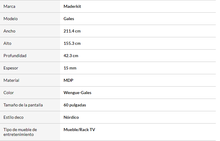 Es hora de cambiar, y el Centro de Entretenimiento Noa Wengue-Gales de Maderkit ¡es la mejor opción! Es un mueble listo para armar; su diseño está inspirado en el estilo minimalista, el cuál emplea una estética sencilla y práctica, que utiliza líneas simples, con muebles de gran tamaño. Se caracteriza por colores lisos, con contrastes intensos, ideal para personas que quieren mantener un estilo ordenado, moderno y que transmita energía. Organiza tus dispositivos y pasa tardes de fútbol, noche de pelis de terror, de drama o maratón de series, darle "play" a tu música favorita y organizar libros u otros objetos. Encuentra todo para tu Sala sólo en Sodimac Homecenter.