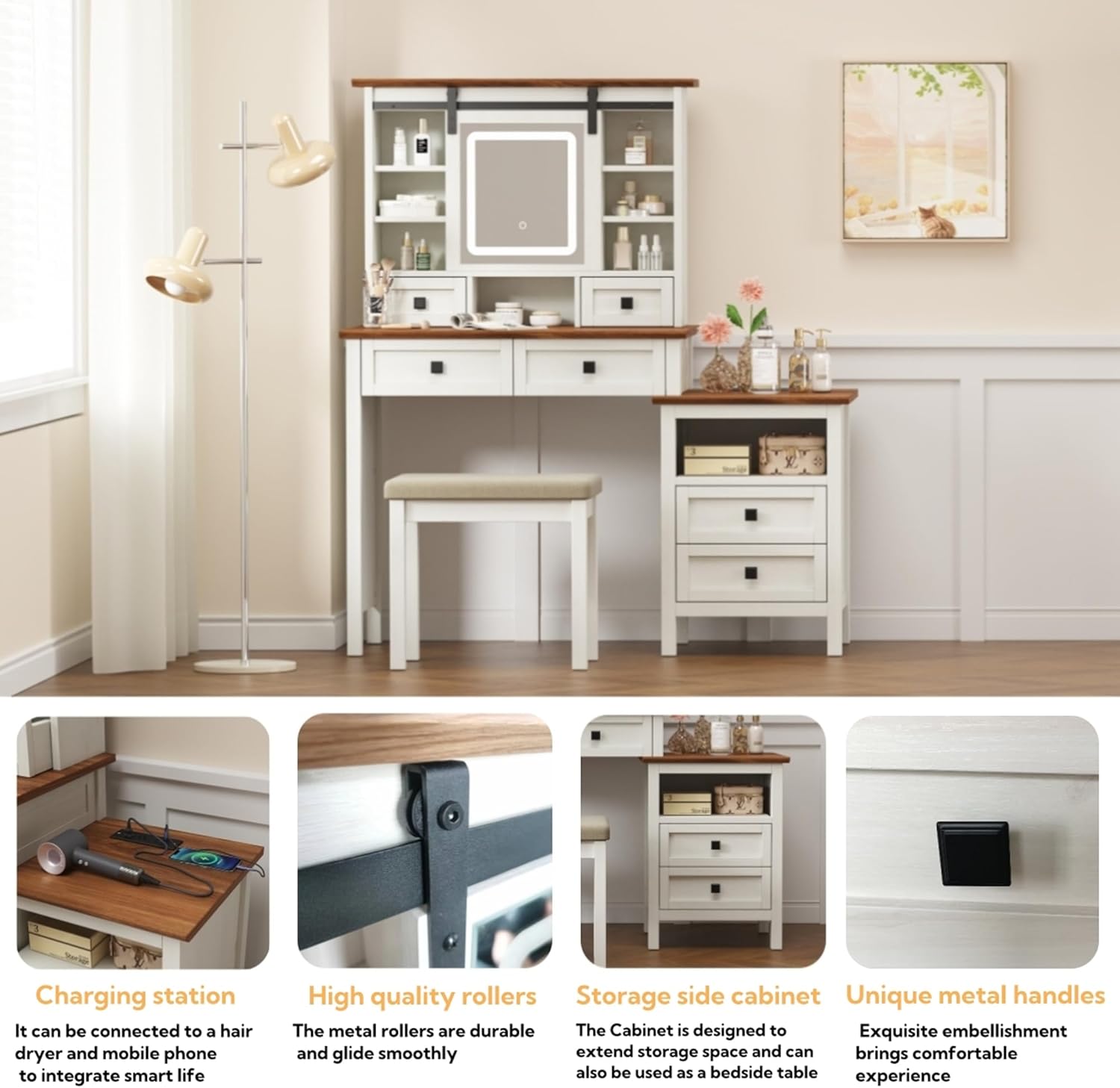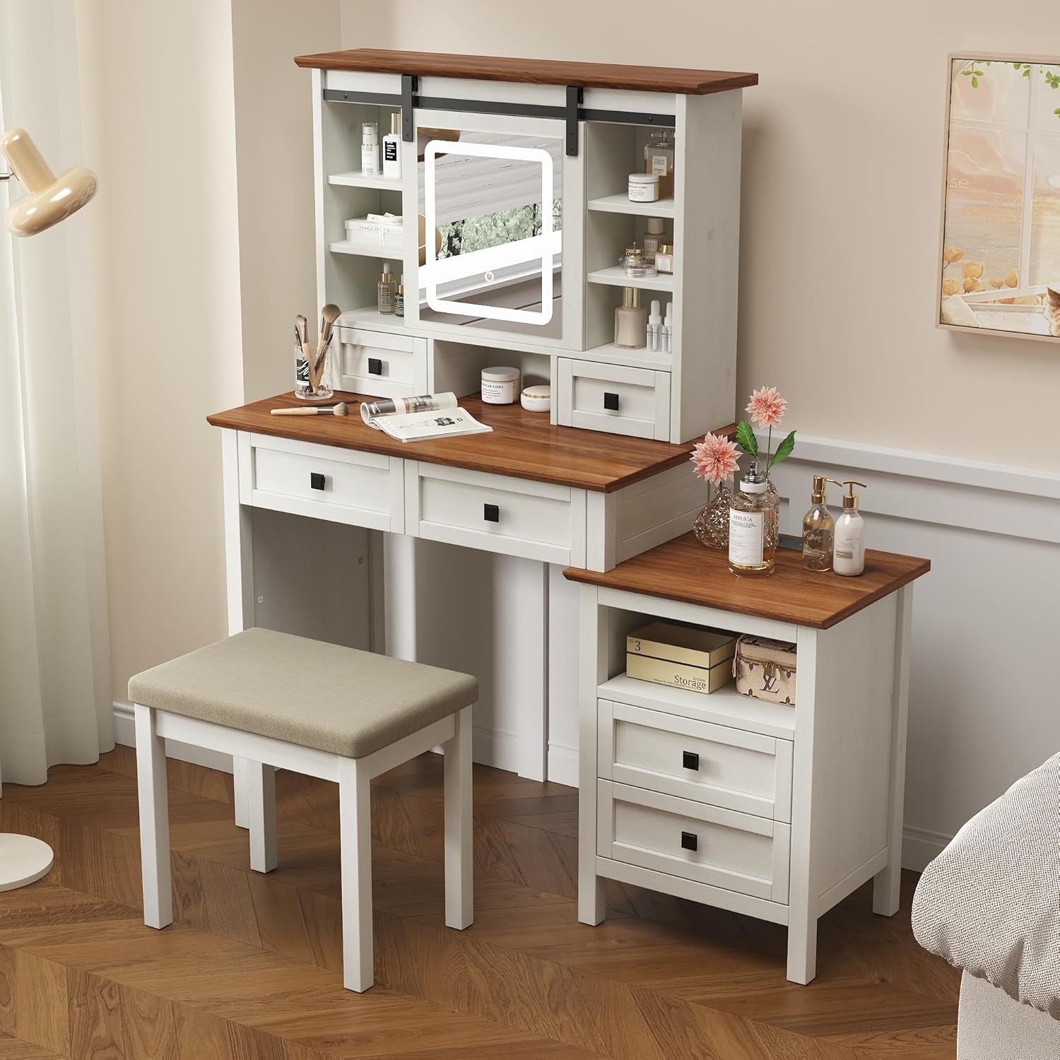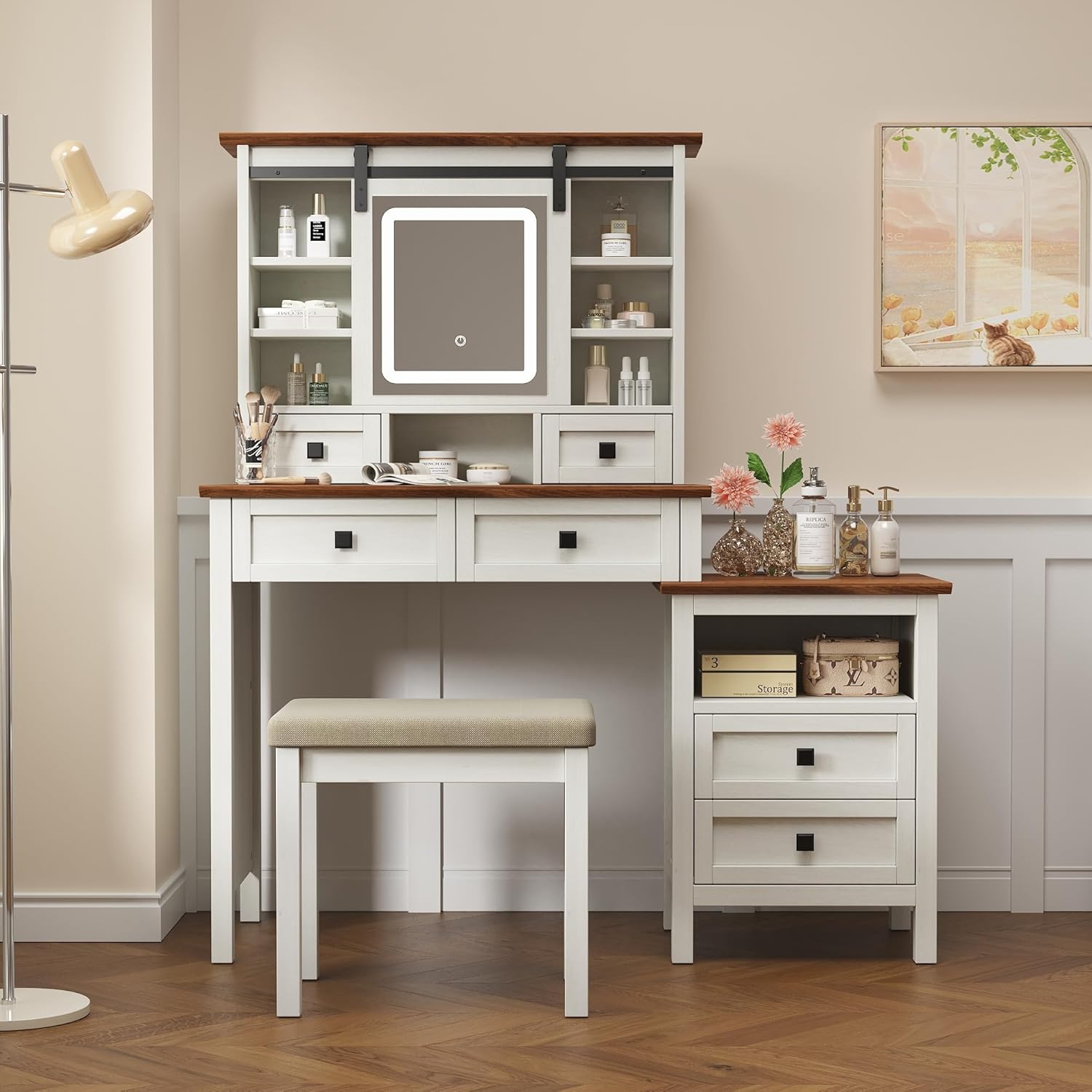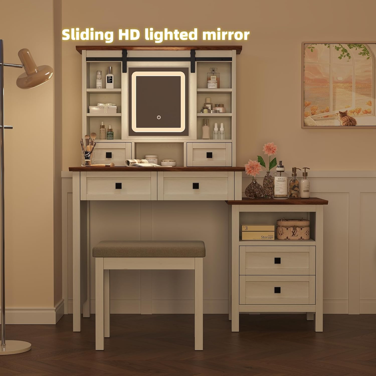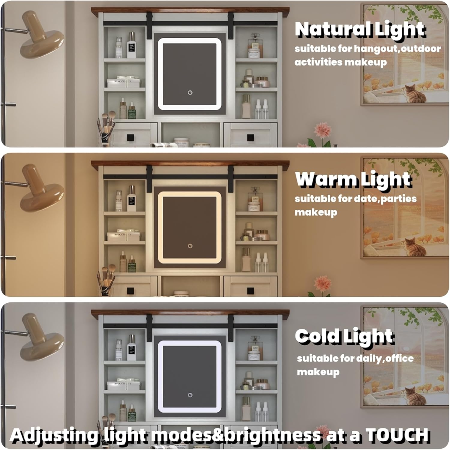 - 【3 Color Adjustable Touch Screen Mirror】This farmhouse vanity desk features a makeup mirror with touchscreen adjustment. Click the screen to wake up/switch the color mode (cool white, warm white, warm yellow). Simple operation and easy to use. The smart dimming mirror provides the perfect lighting environment for your makeup