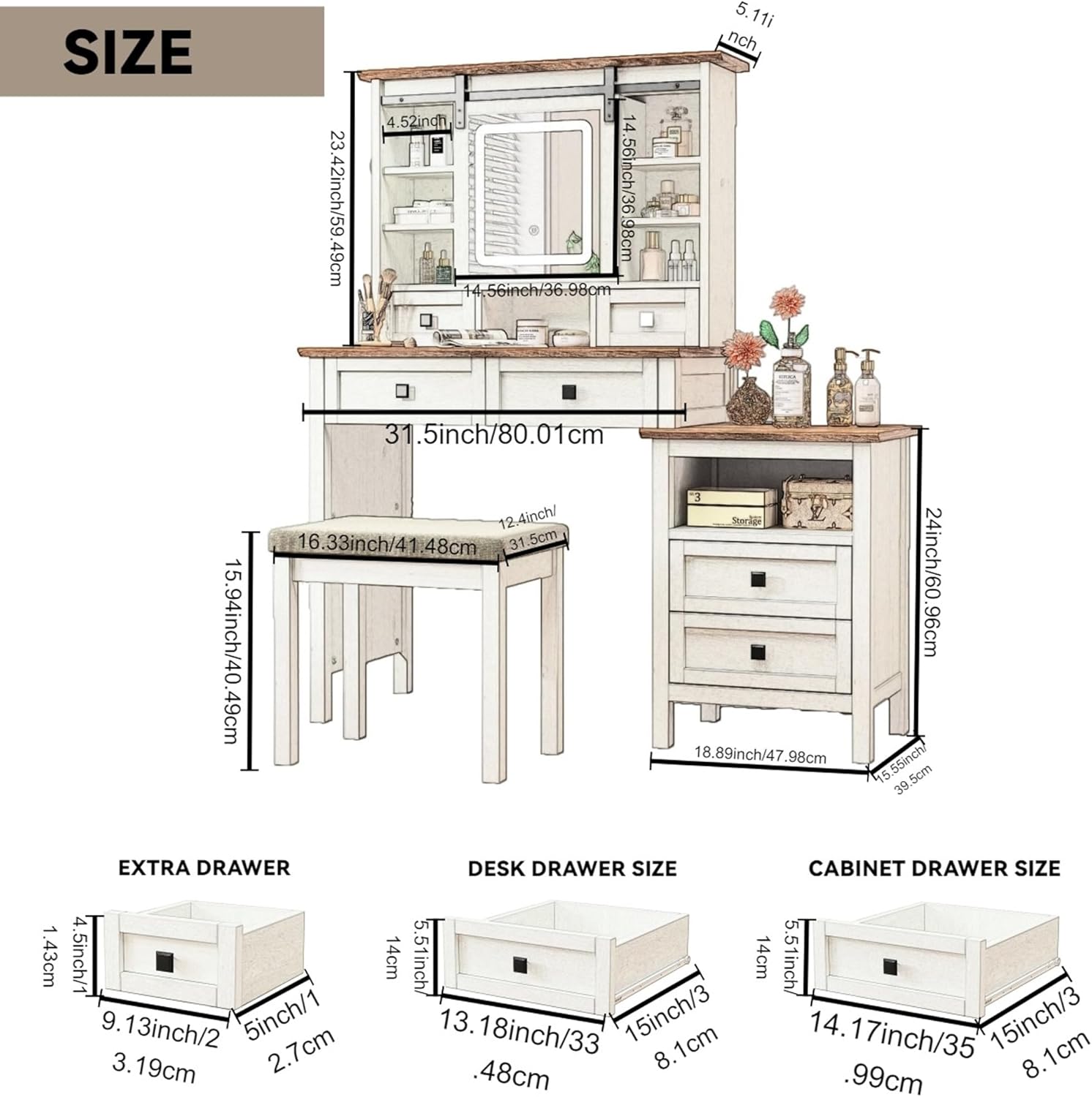 - 【Farmhouse Style with Sliding Mirror】This is a makeup vanity that shows farmhouse charm. The sliding vanity mirror allows you to use it on the left/right side of the dressing table. With exposed metal rails, and distressed white finish all coming together, this makeup table embodies farmhouse character heartily and adds a relaxed, earthy aesthetic to the room