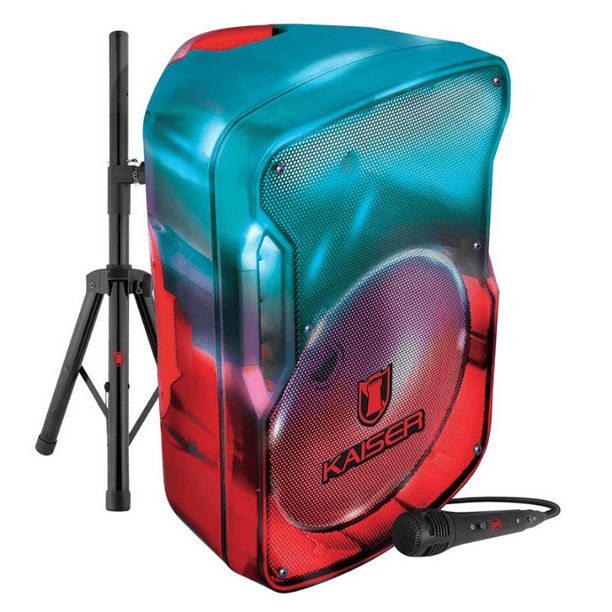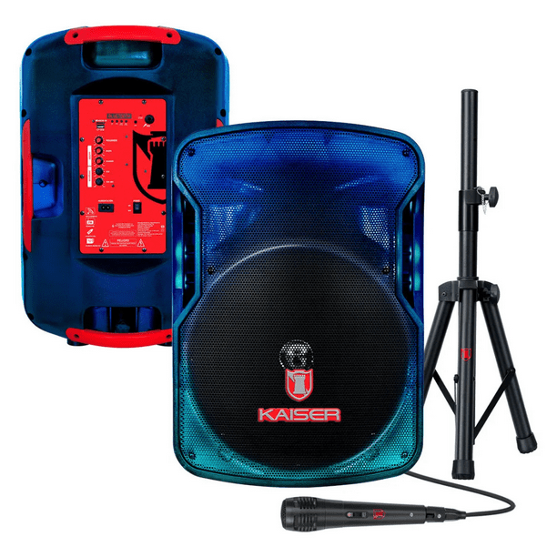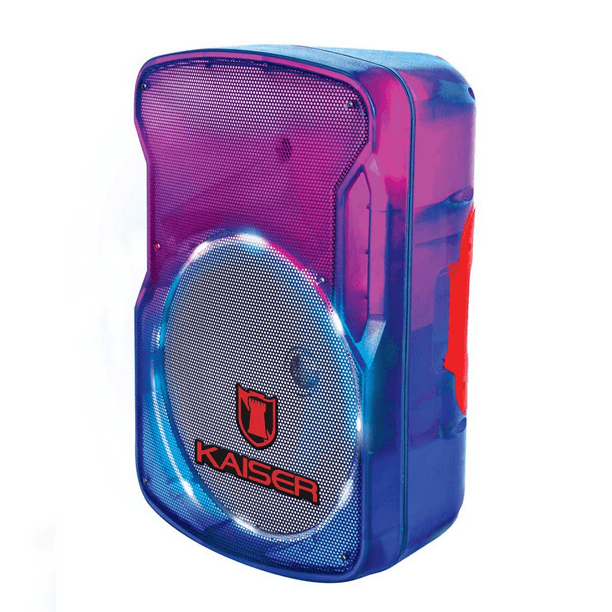 - Reproduce tus canciones favoritas sin parar con el bafle profesional KAISER® con efecto audiorítmico. No te quedes sin energía gracias a su batería recaragable y LED indicador. Permite que el sonido se expanda por el Bluetooth® con su alcance de hasta 10 m. Tecnología KSRLINK 9.2, permite enlazar otra bocina con la misma tecnología Potencia de audio 25,000 W PMPO 40 W RMS Efecto audiorítmico LED indicador de estatus de la batería Impedancia 3,6 ohm Luz multicolor efecto flama y cuerpo translúcido FUNCIONES Bluetooth® con alcance de hasta 10 m Radio FM Función de prioridad de audio del micrófono Perillas independientes de volumen general, graves, agudos, micrófono y eco Cable para cargar la batería Tripié Micrófono alámbrico Medidas: 46 cm x 37.5 cm x 65.1 cm