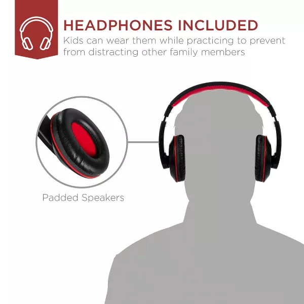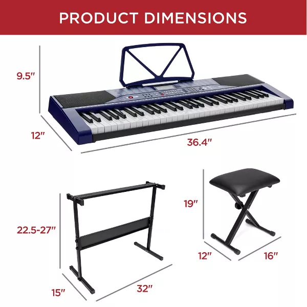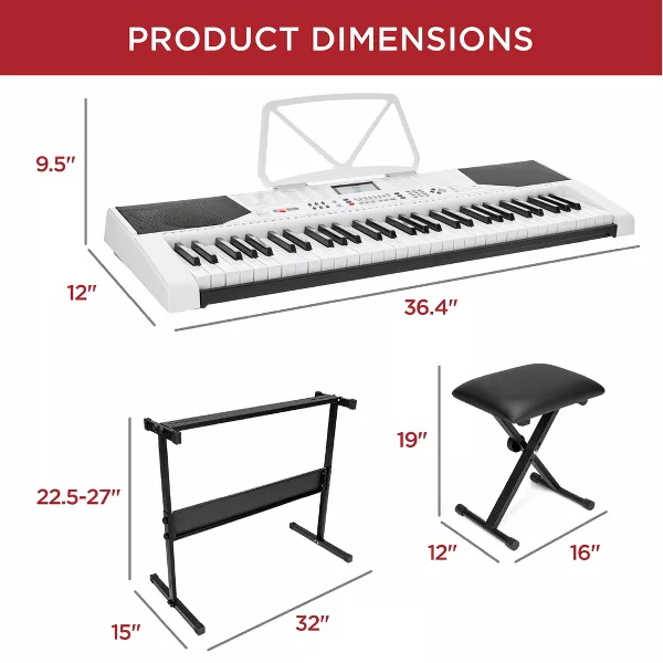 Making music has never been so easy! Learn by playing, follow along as keys light up in teaching mode, and play your way to proficiency. Create your own full masterpiece when you mix timbres and rhythms or explore the keyboard percussion sounds and in effect, customize your sound. Here's what's included: a keyboard, a music holder, a stand (15in x 32in x 22.5-27in), and a chair (12in x 16in x 19in). All of these tools are perfect for beginners, as they explore this piano's different functions and use them to sharpen their playing skills. Headphones are included, wear them to cancel surrounding distractions when you need that extra focus thanks to the padded speakers. From pros to beginners this piano is ready for you!